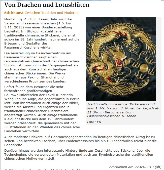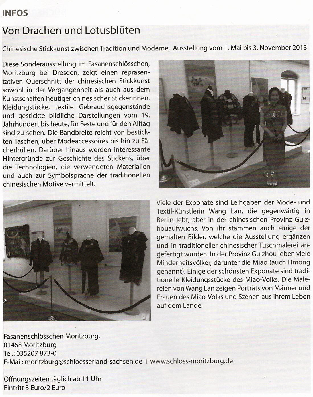 - Soloausstellung „Von Drachen und Lotusblüten, “Grabau-Stiftung in Schloss Moritzburg – Fasanenschlösschen