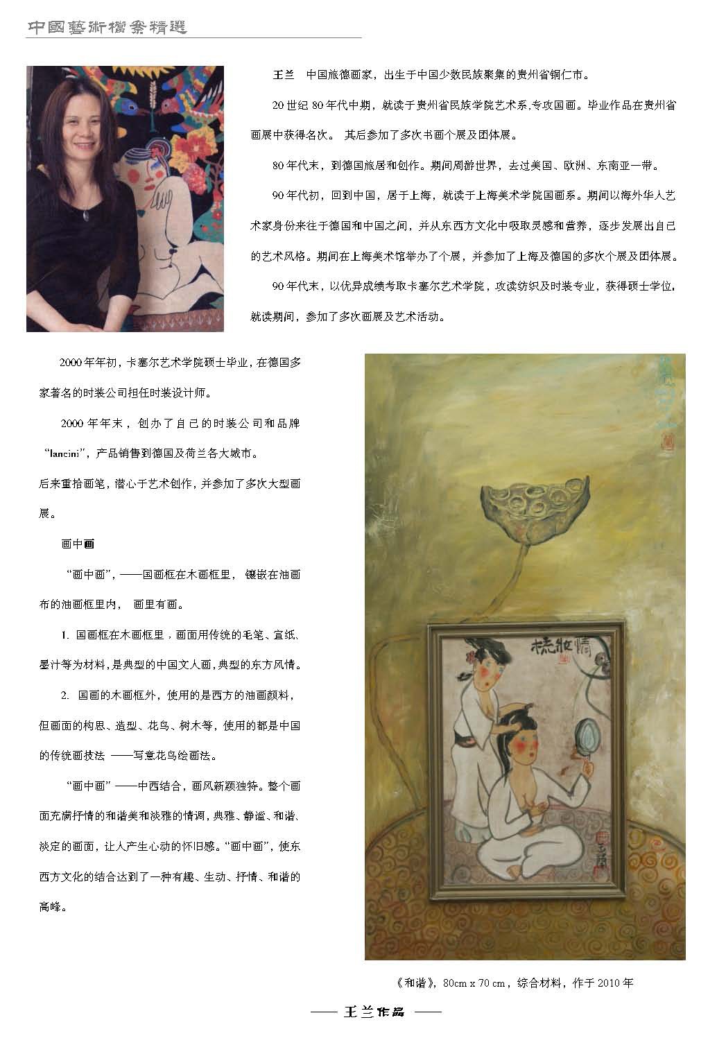 Während sie in China lebte, wurden Ihre Arbeiten in diversen Einzel- und Gruppenausstellungen gezeigt. Beispielsweise: 1988 - Gruppenausstellung Guiyang, Guizhou; 1989 - Einzelausstellung Tongren, Guizhou, 1993 - Einzelausstellung in der Shanghaier Kunsthalle. Außerdem veröffentlichte sie den Bildband " A Collection of Artistic Works by Wang Lan" Shanghai Books Publishing House, 1993.