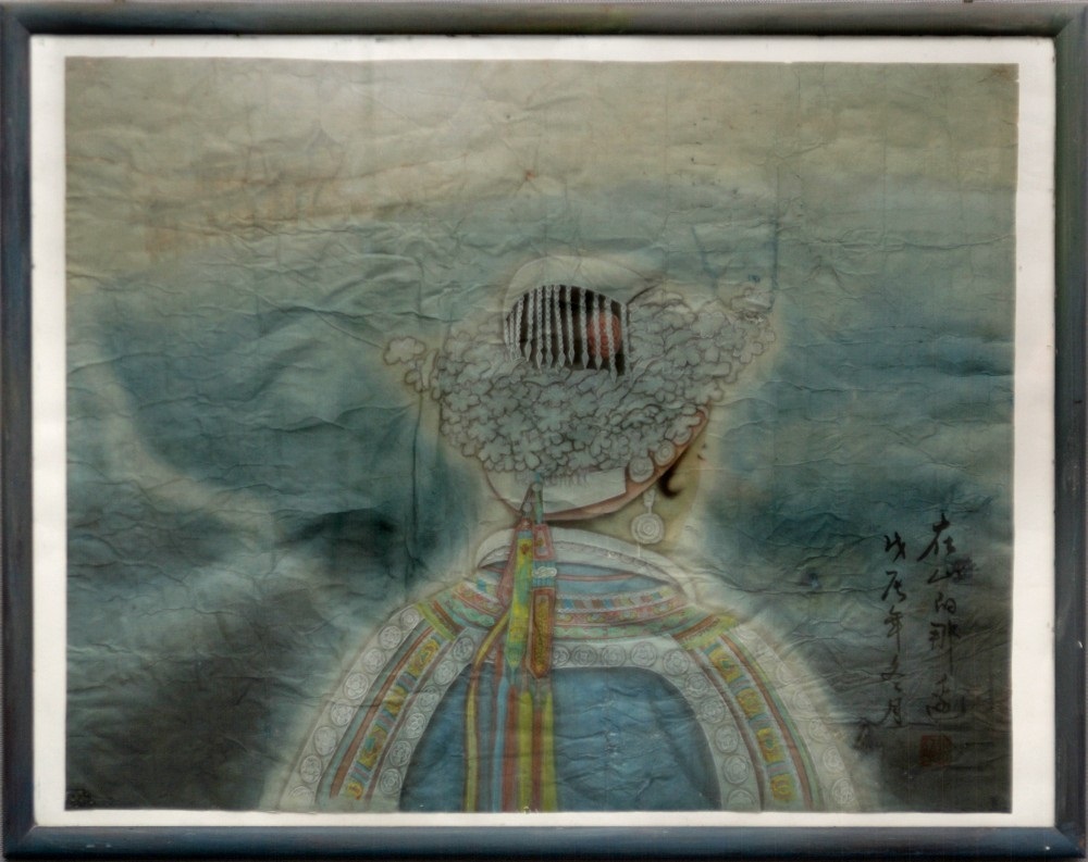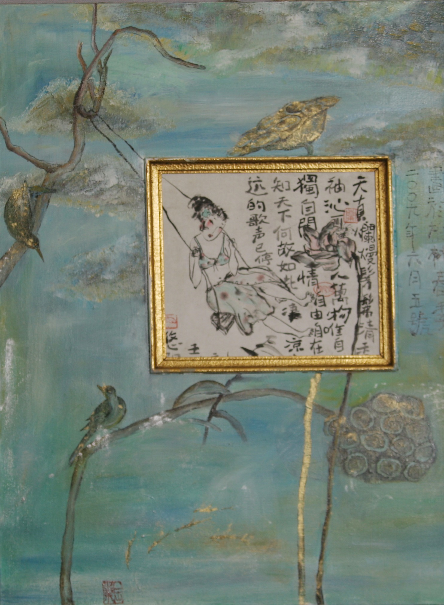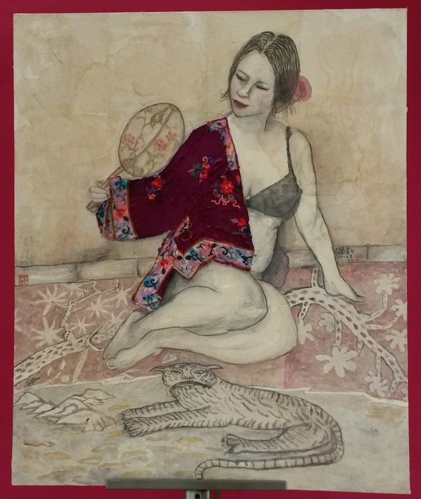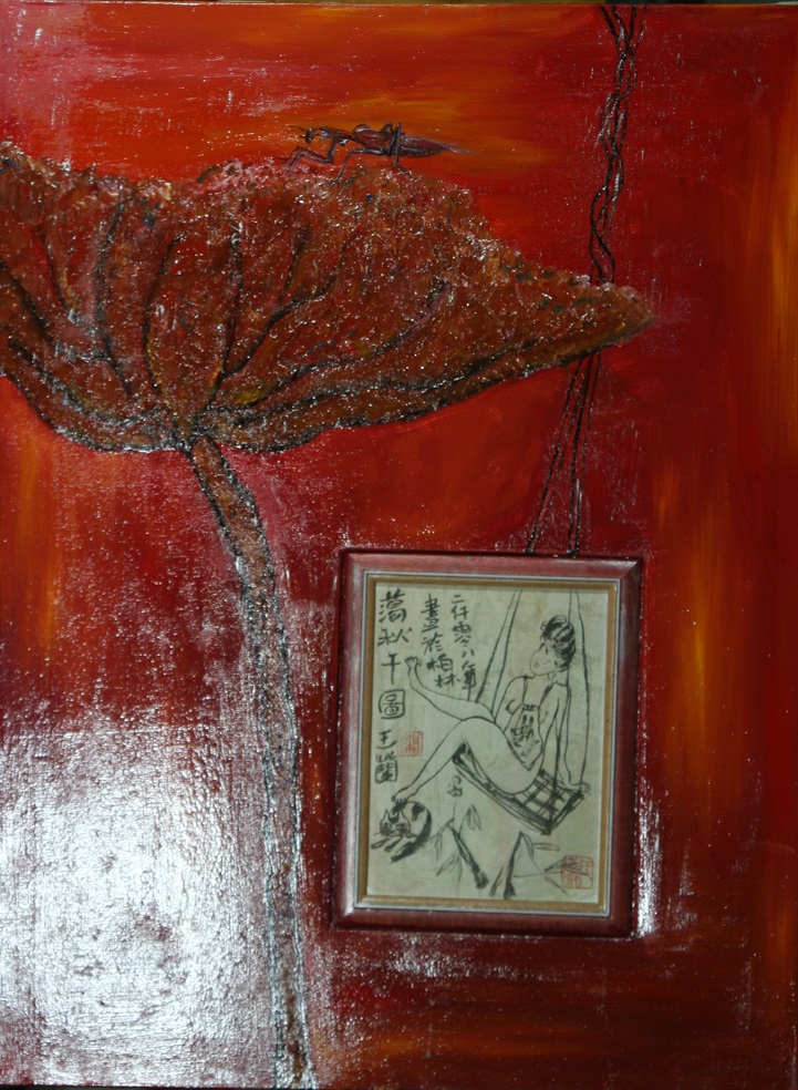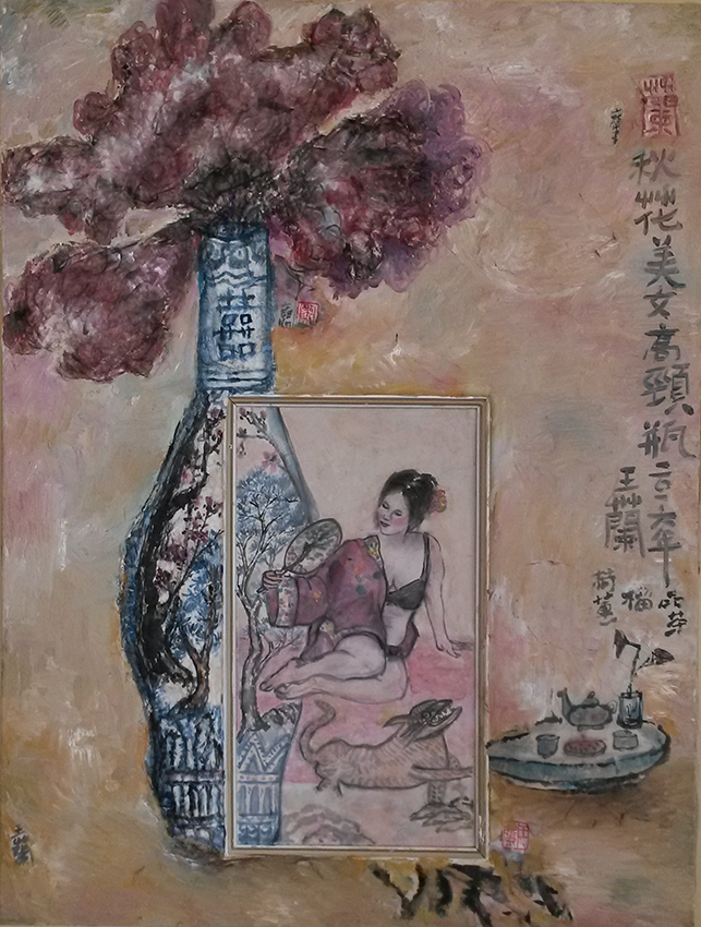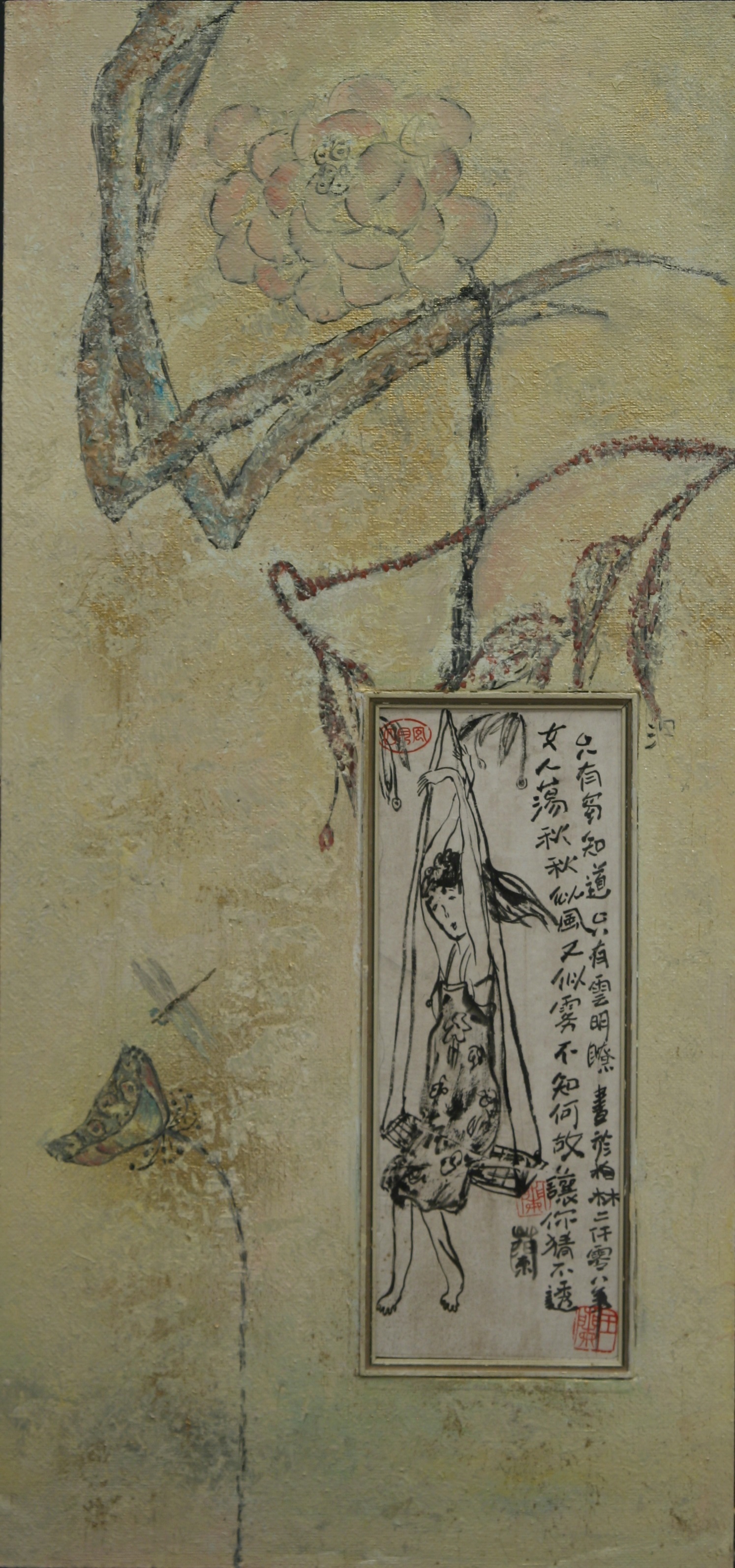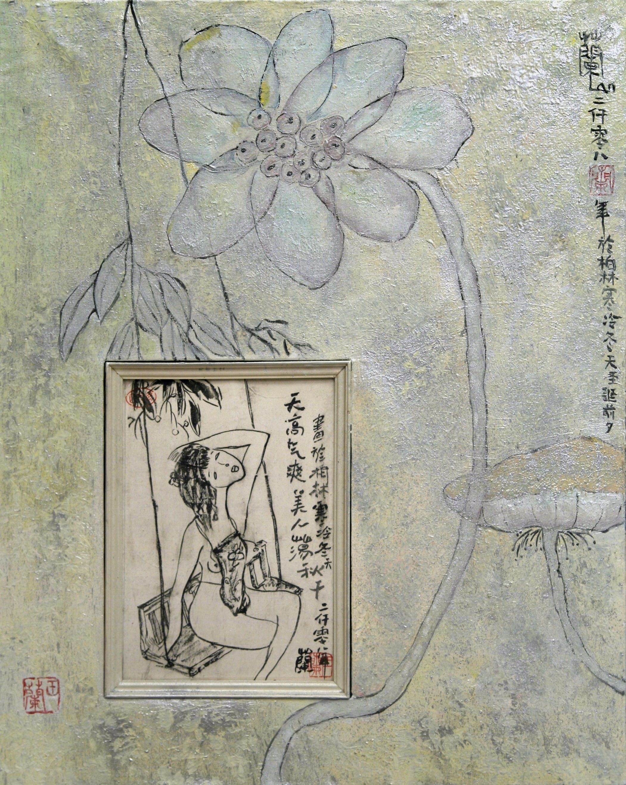 Reispapier über Leinwand, bestickte Seidenjacke + chinesische Wasserfarbe und Tusche.