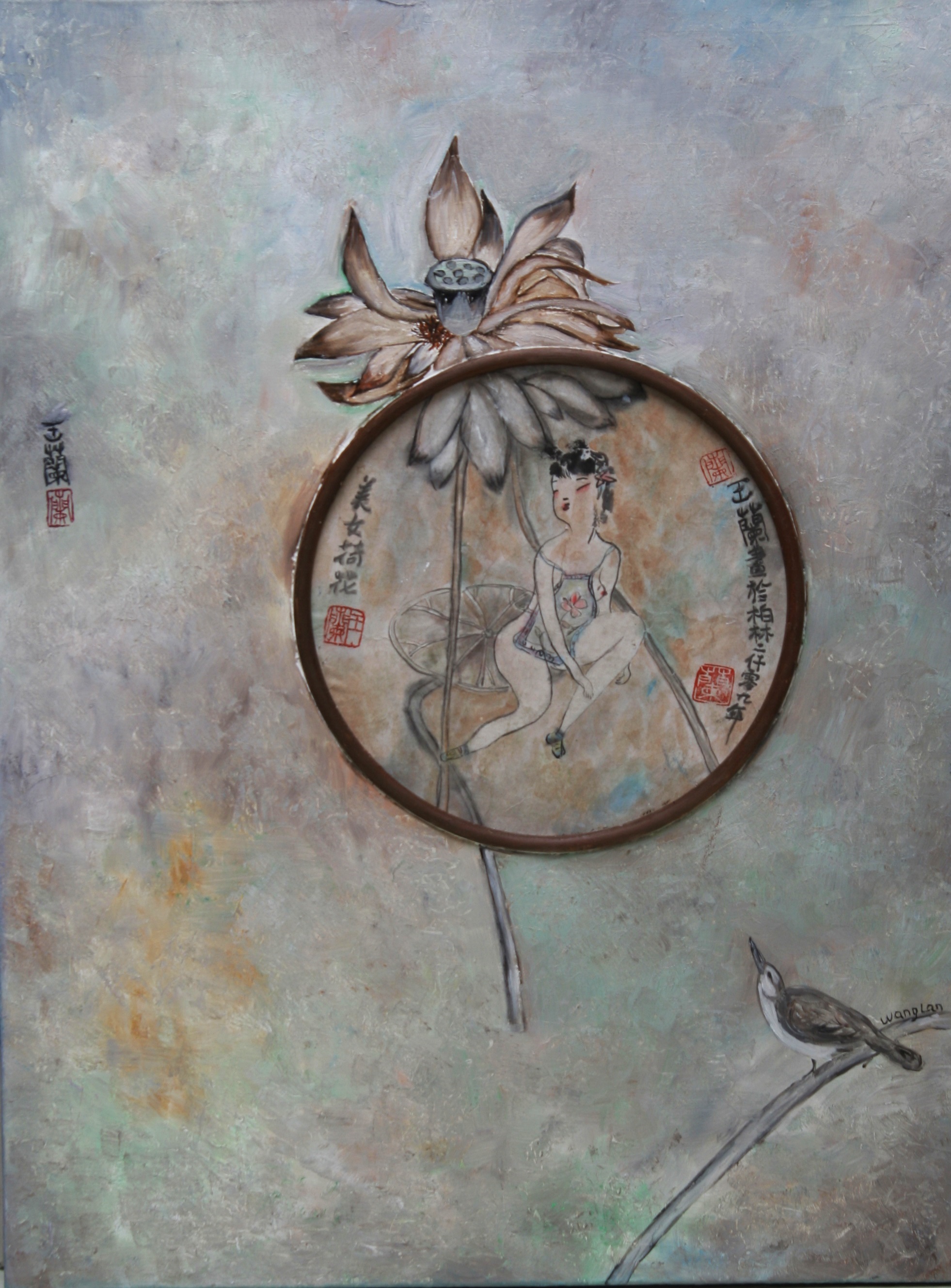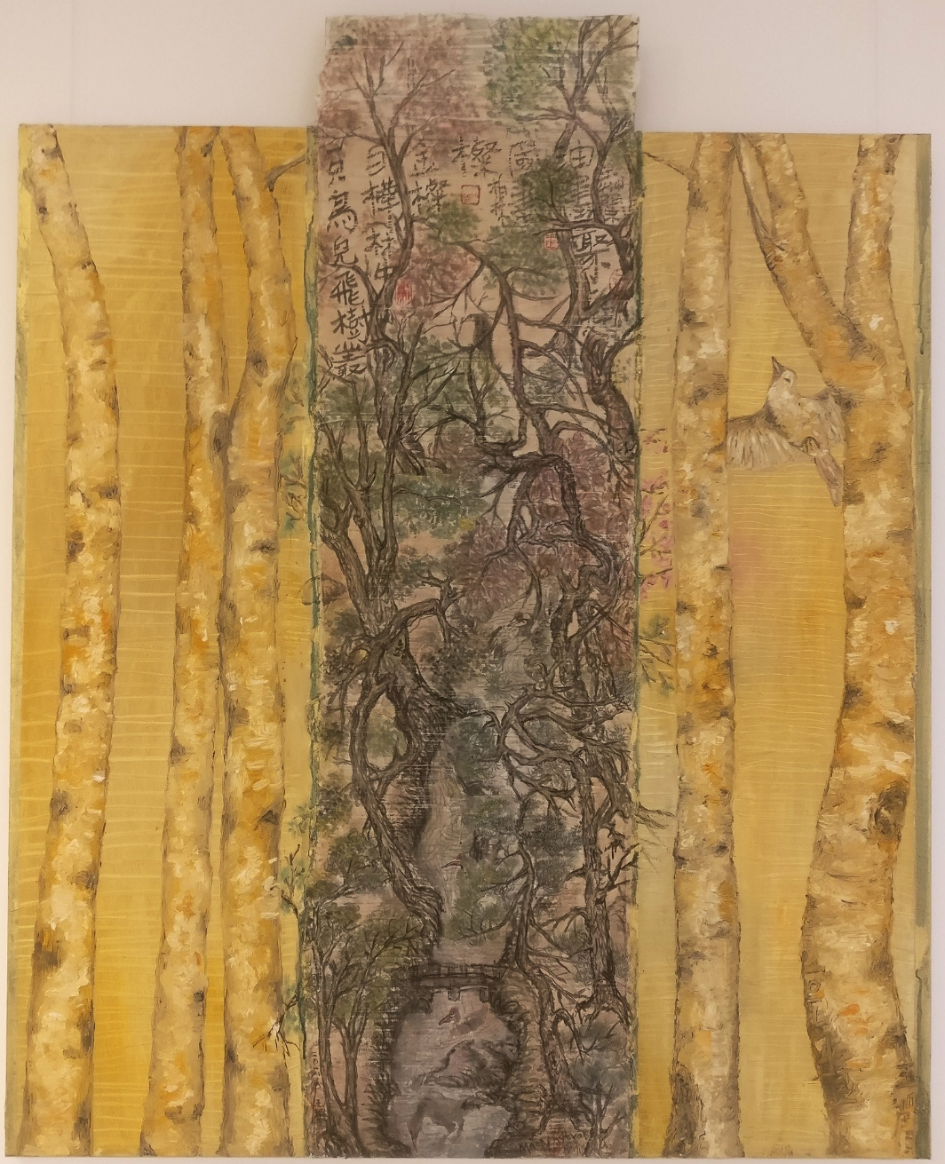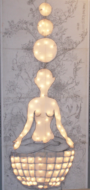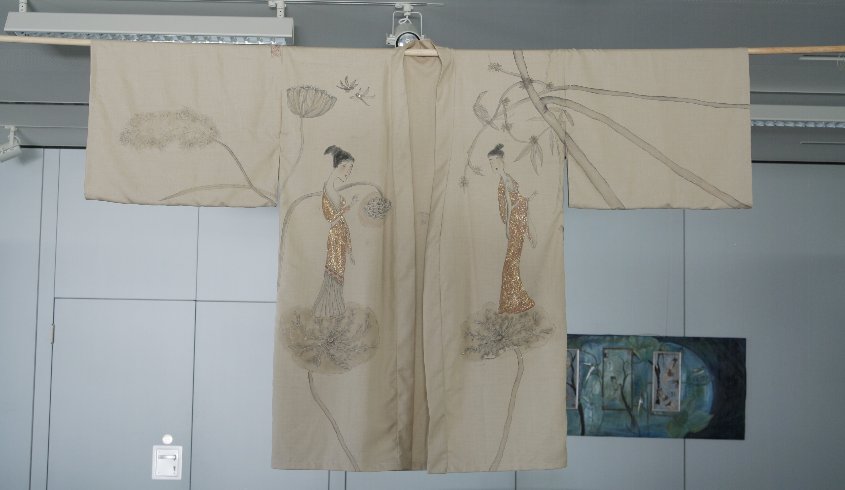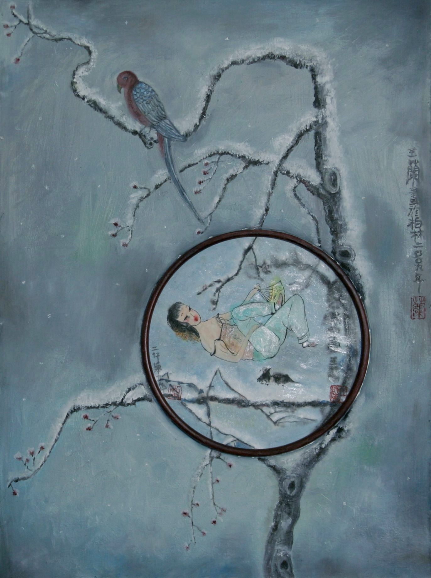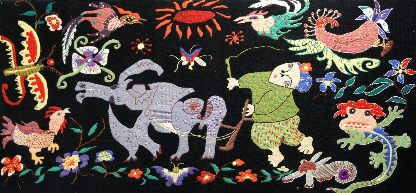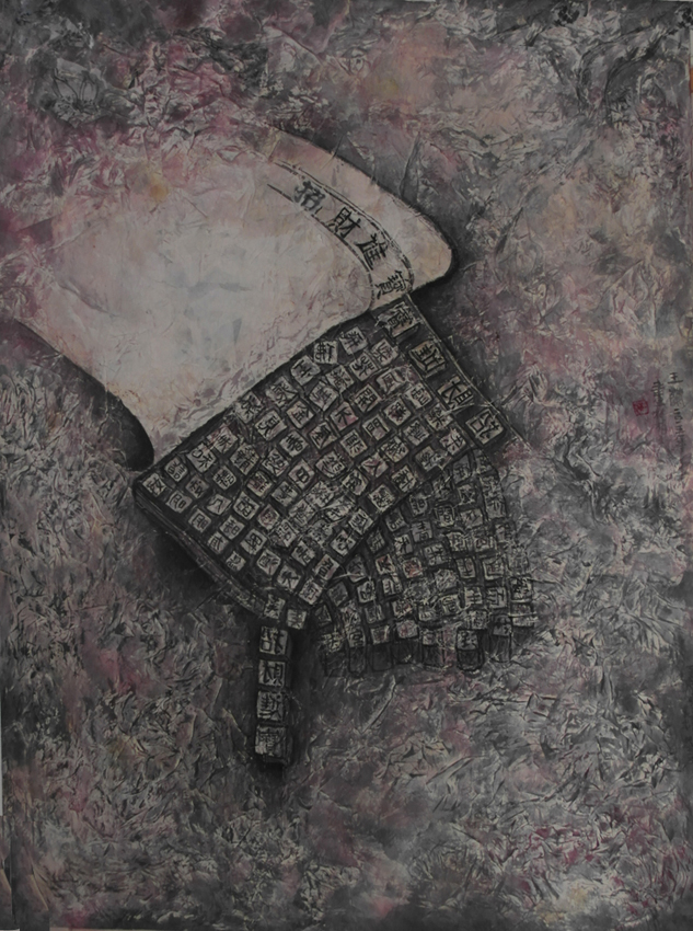 Reispapier über Leinwand, bestickte Seidenjacke + chinesische Wasserfarbe und Tusche.