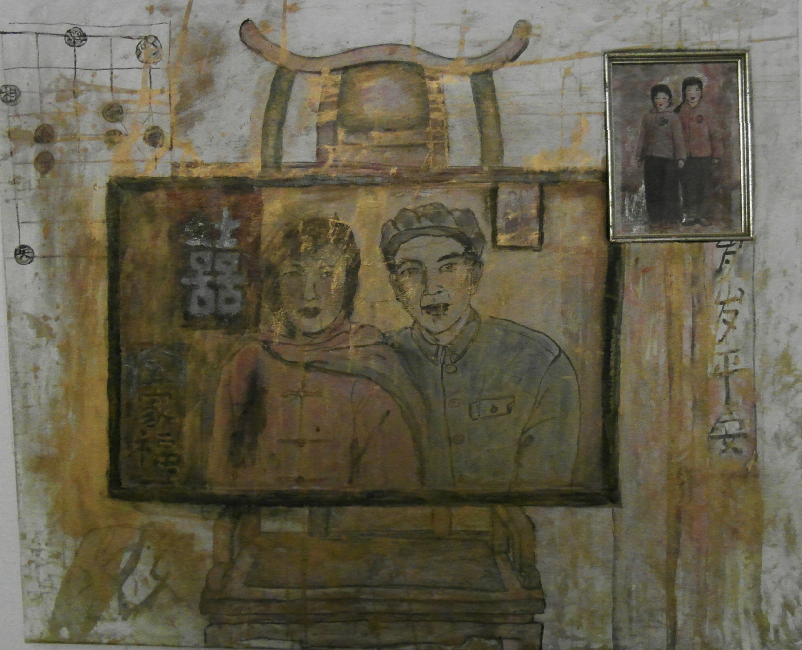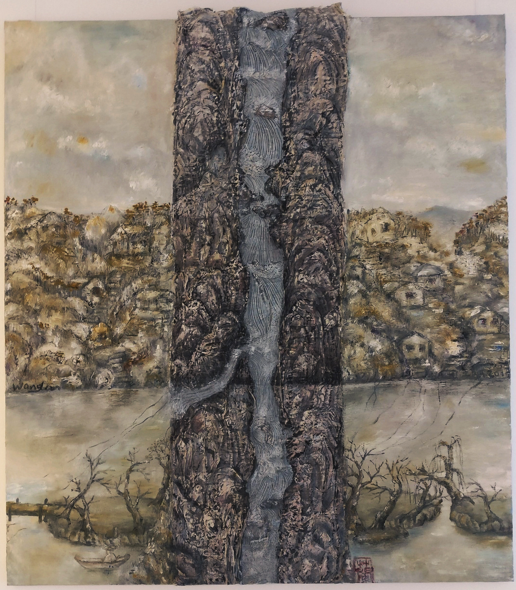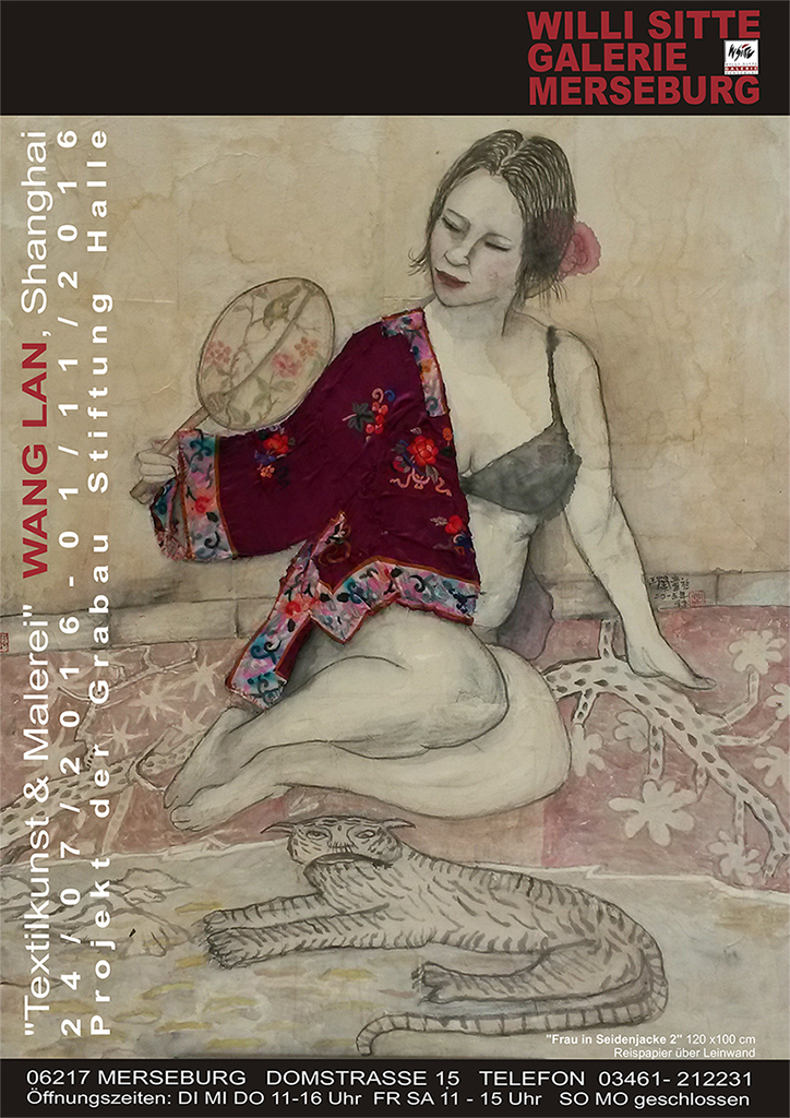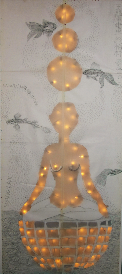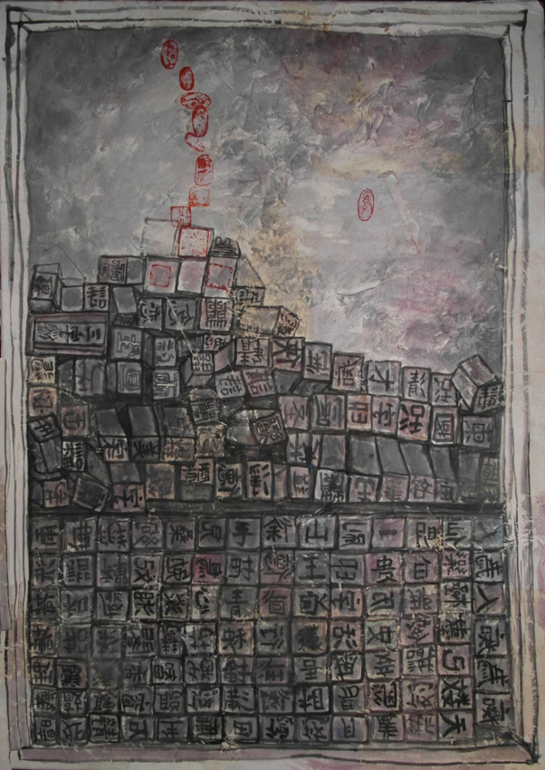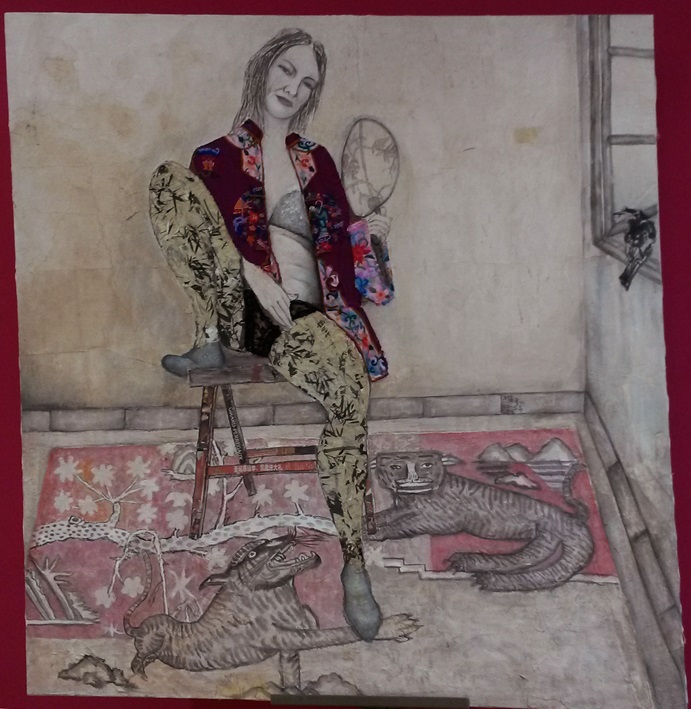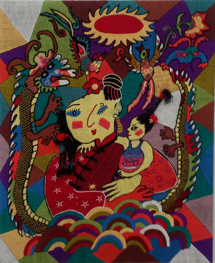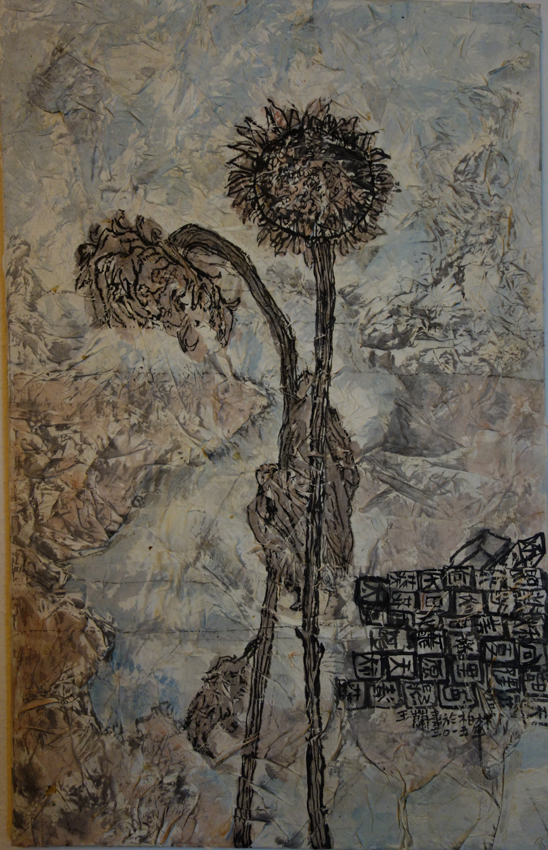 Reispapier über Leinwand, bestickte Seidenjacke + chinesische Wasserfarbe und Tusche.