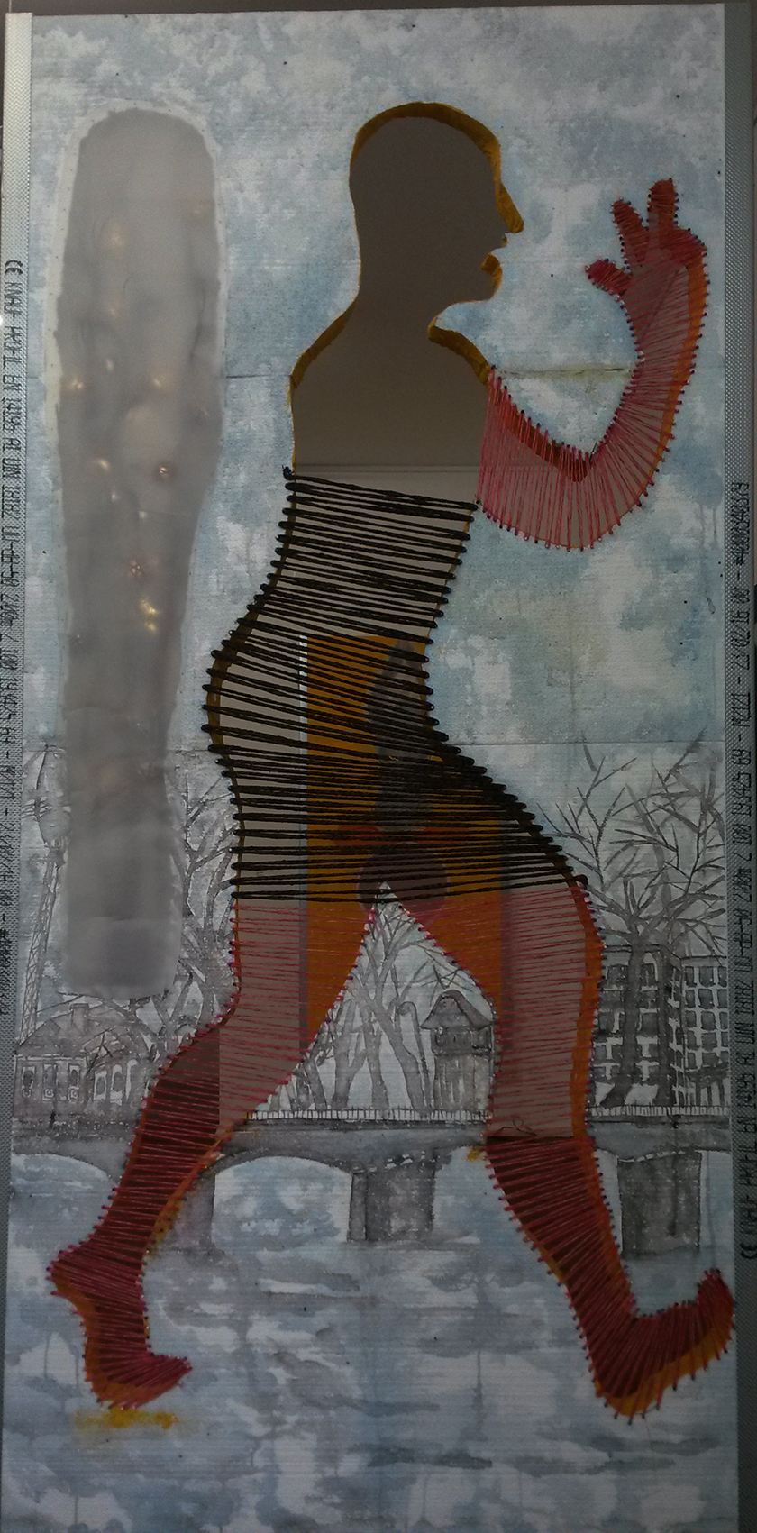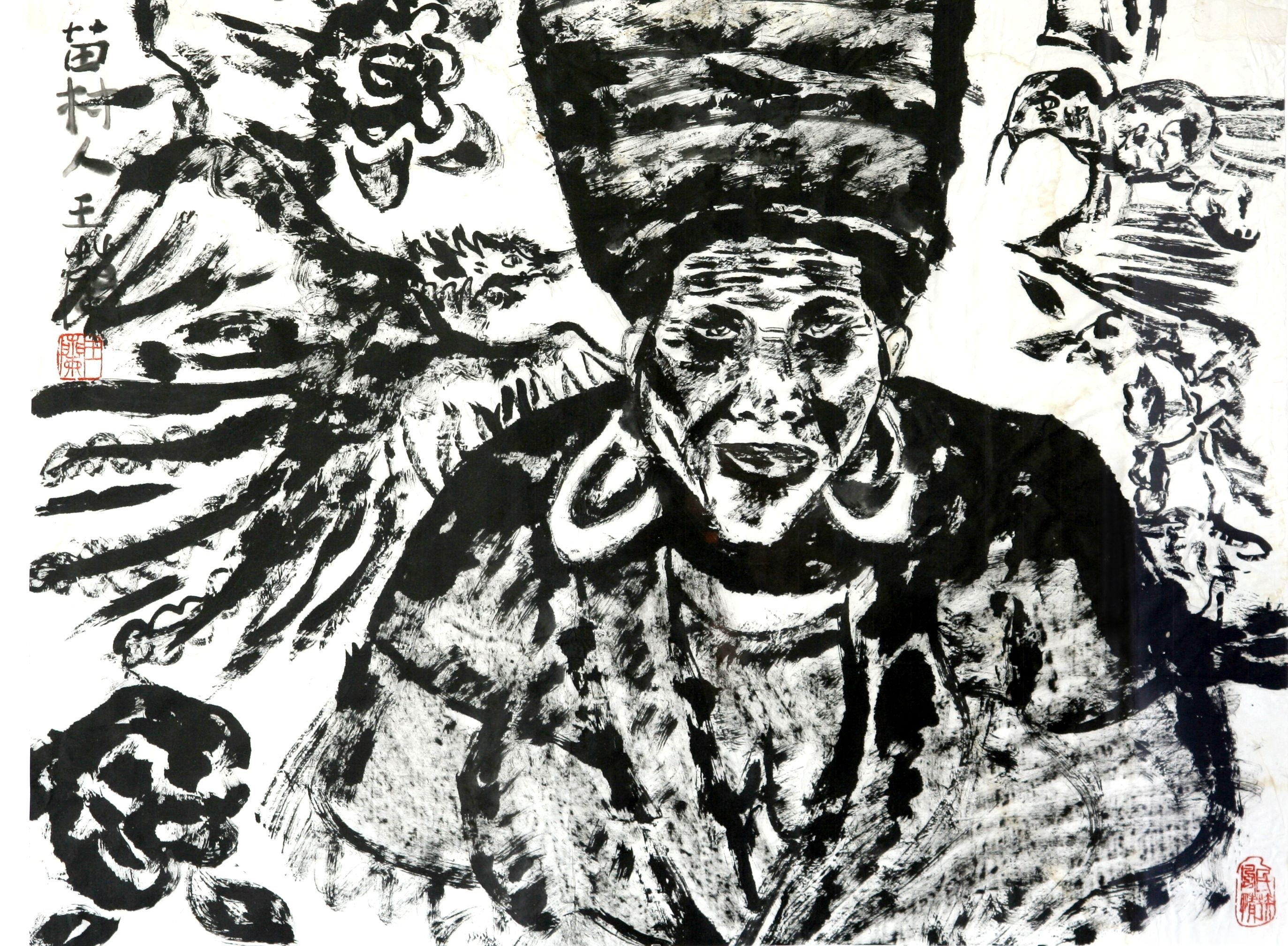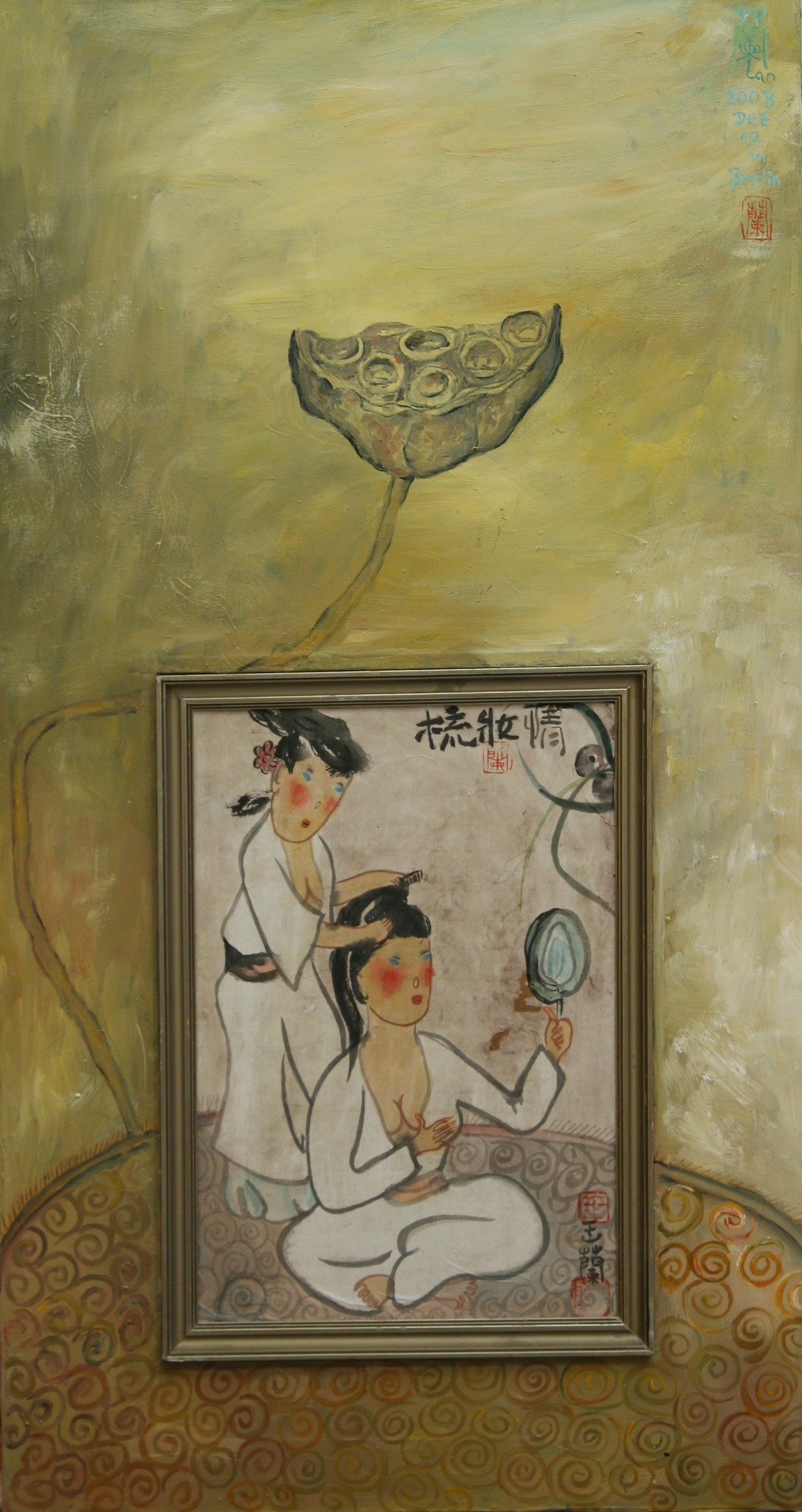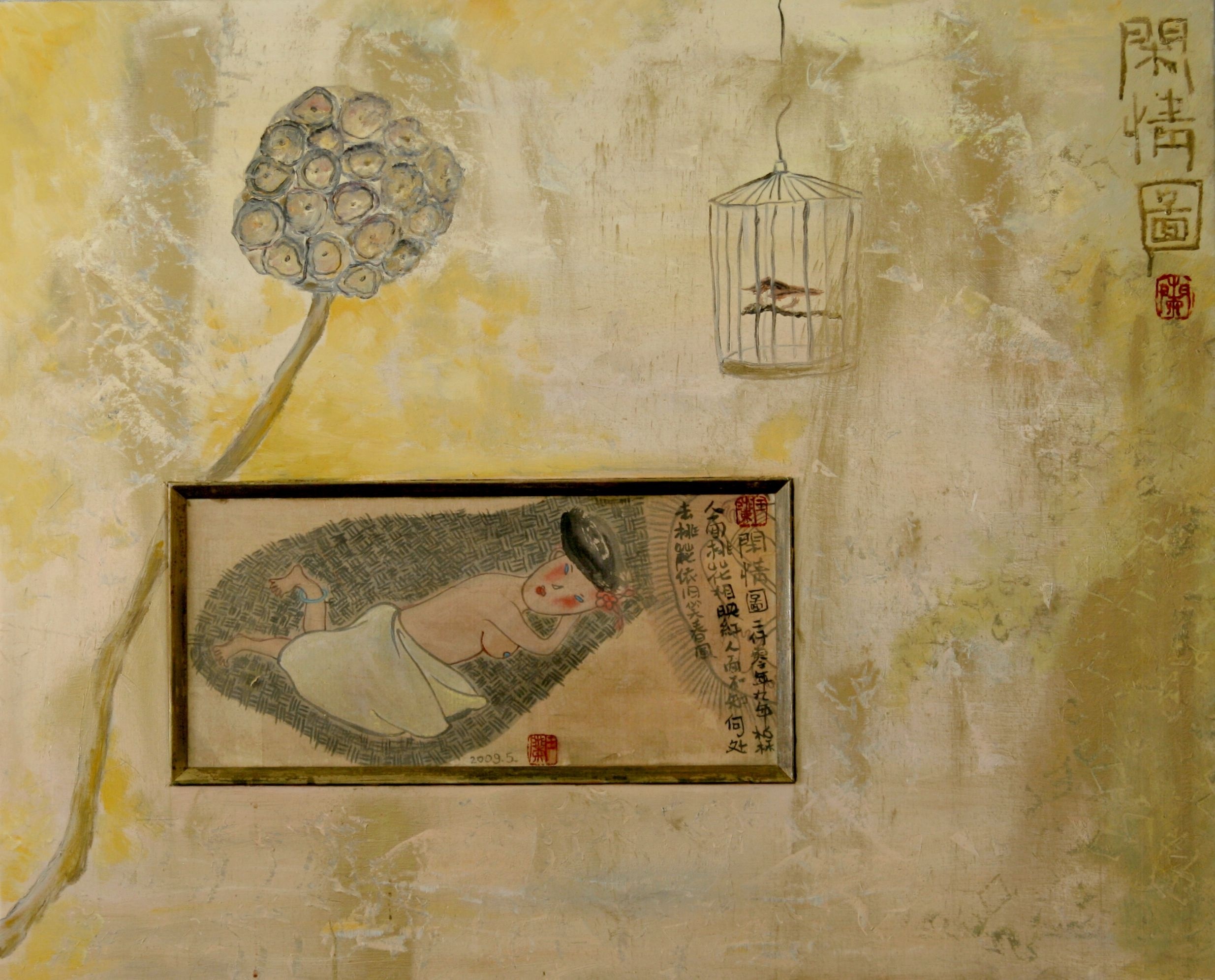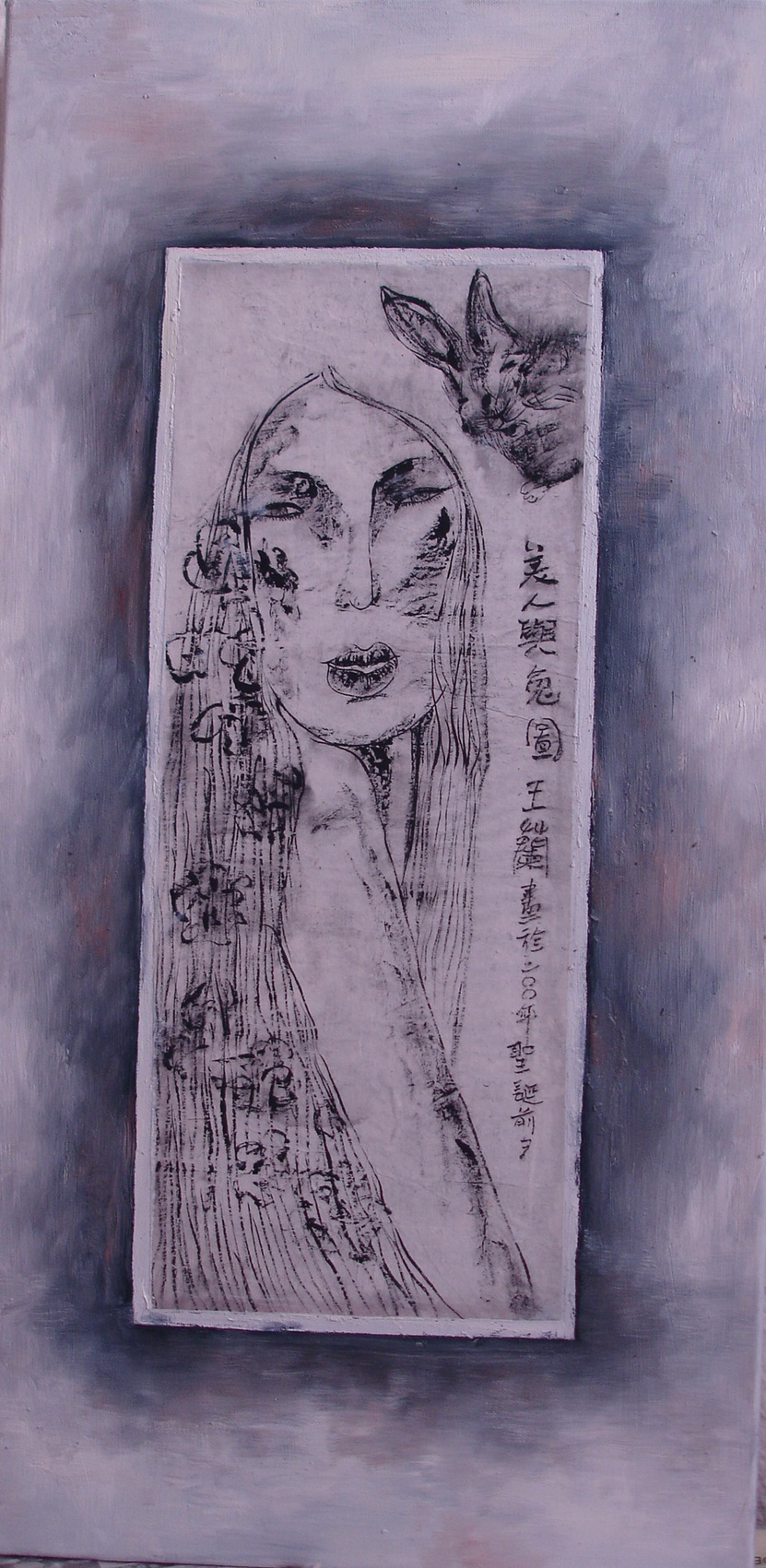 Reispapier über Leinwand, bestickte Seidenjacke + chinesische Wasserfarbe und Tusche.