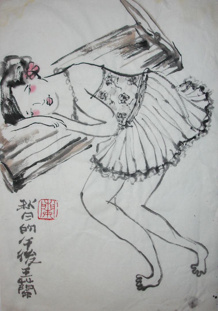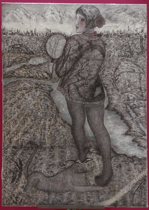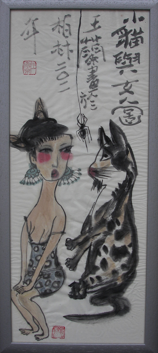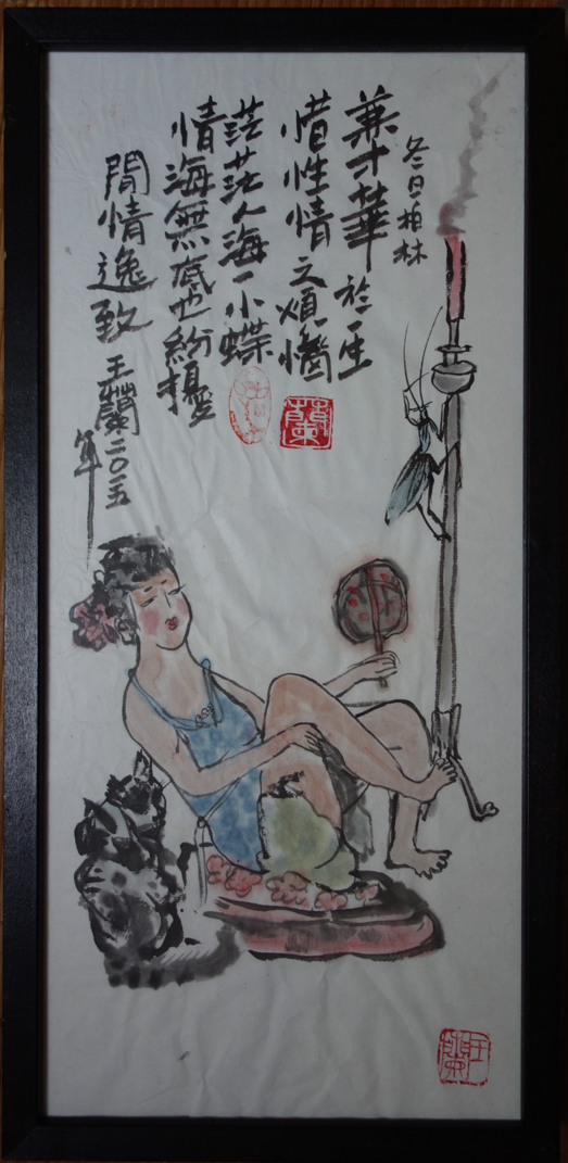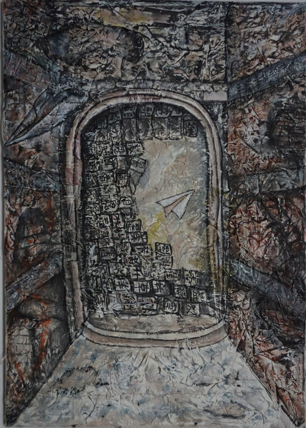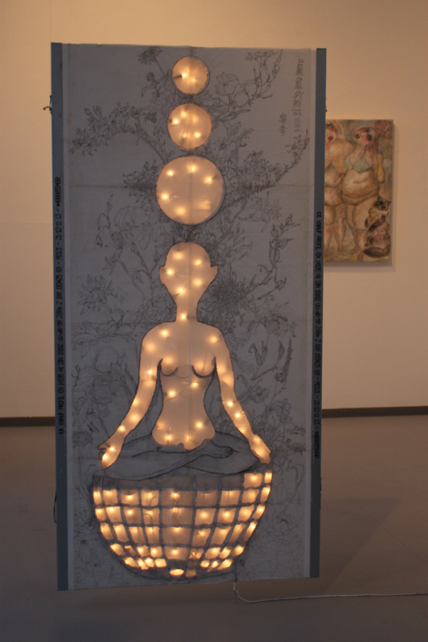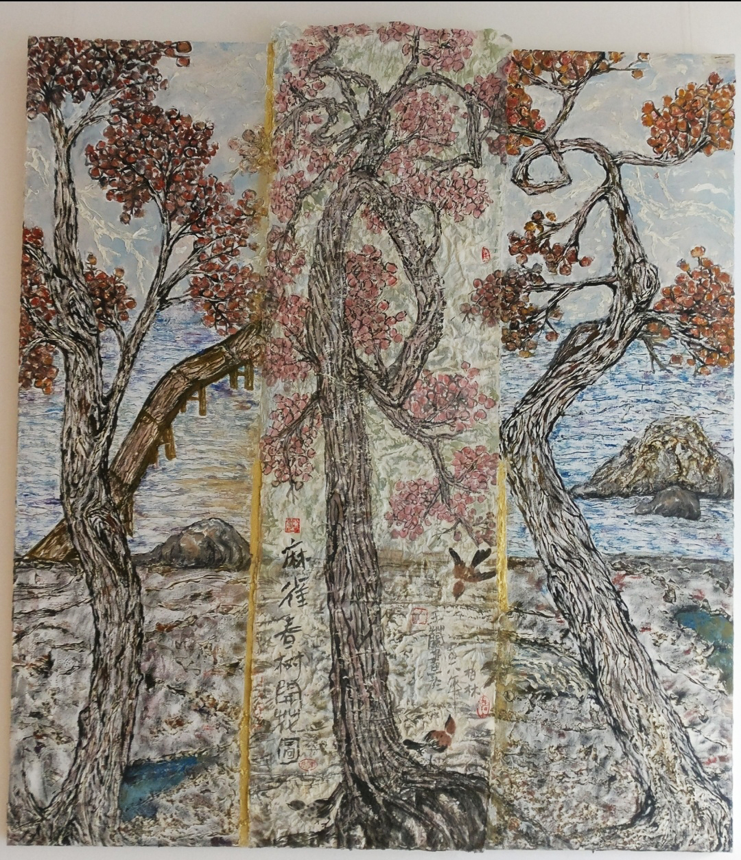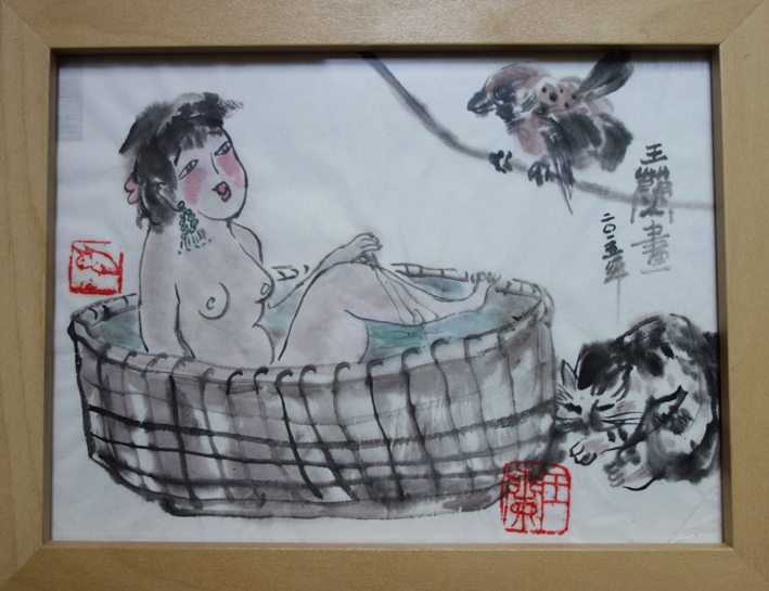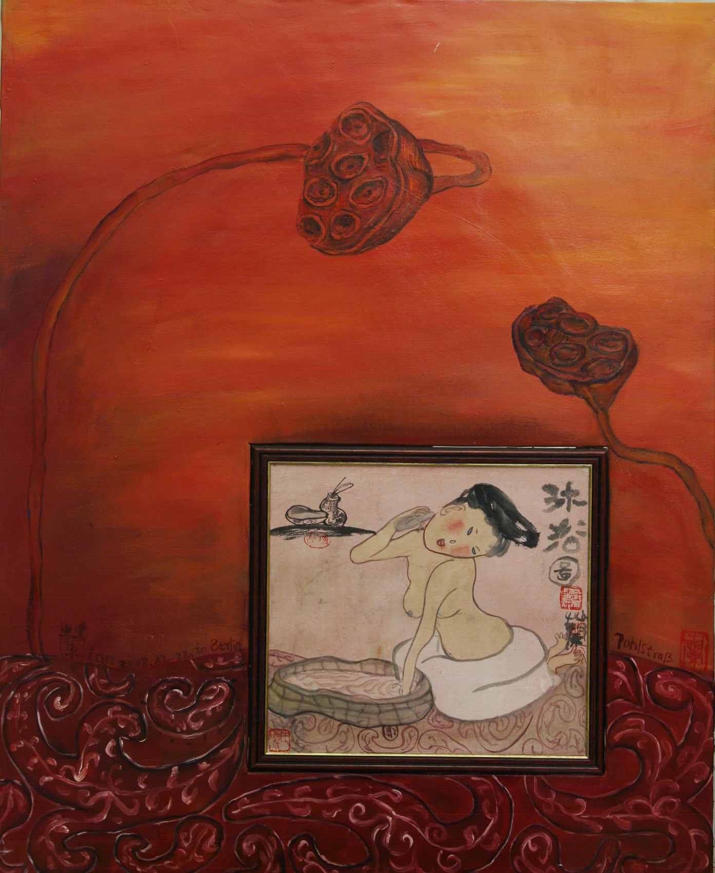 Reispapier über Leinwand, bestickte Seidenjacke + chinesische Wasserfarbe und Tusche.