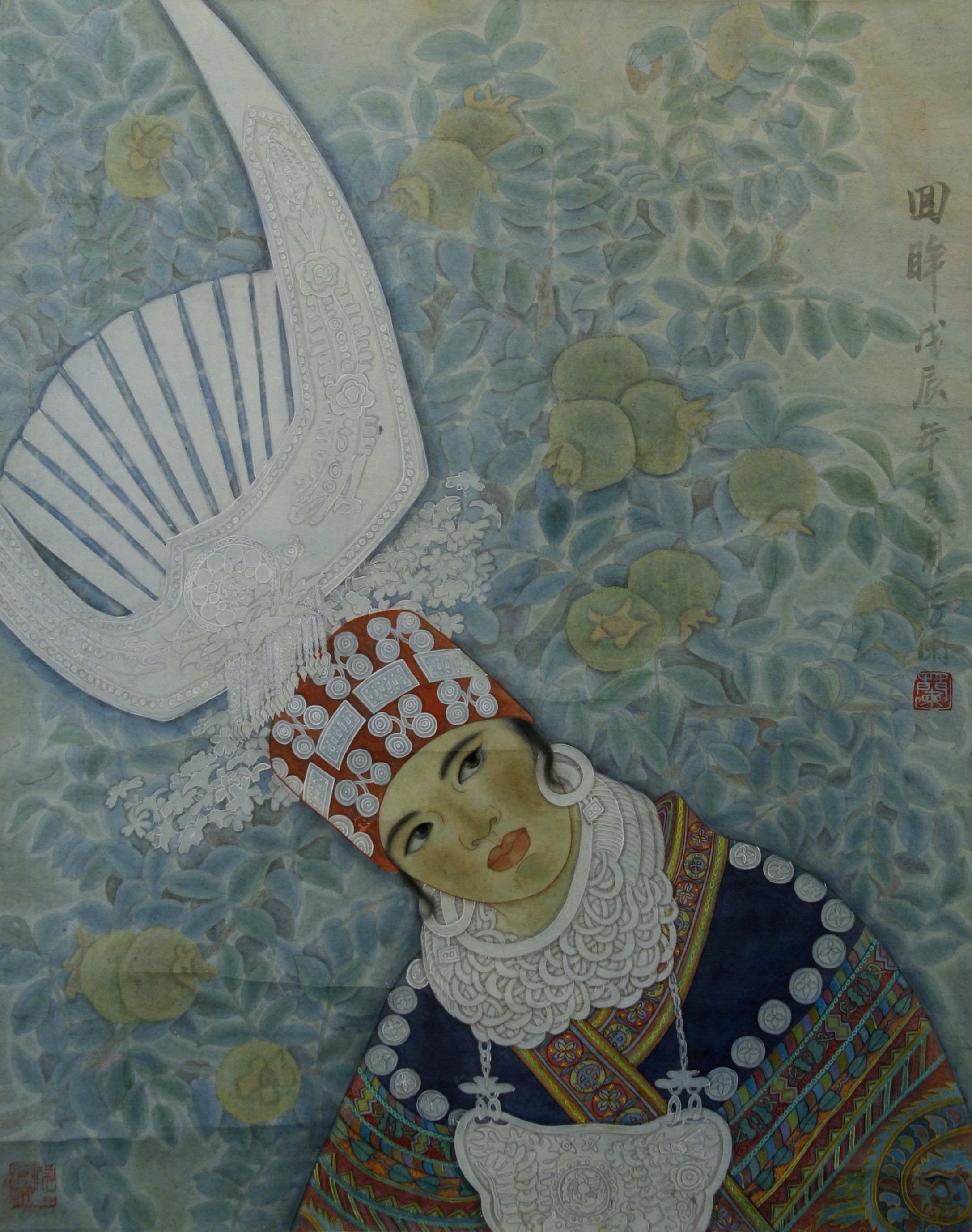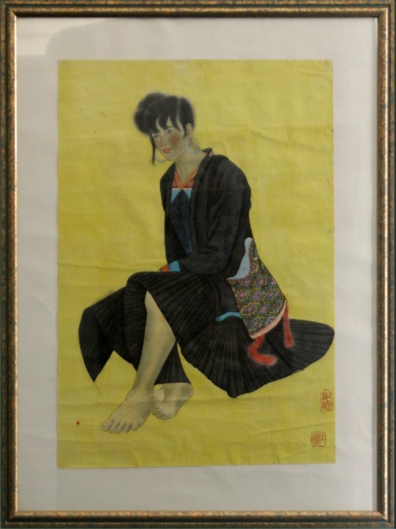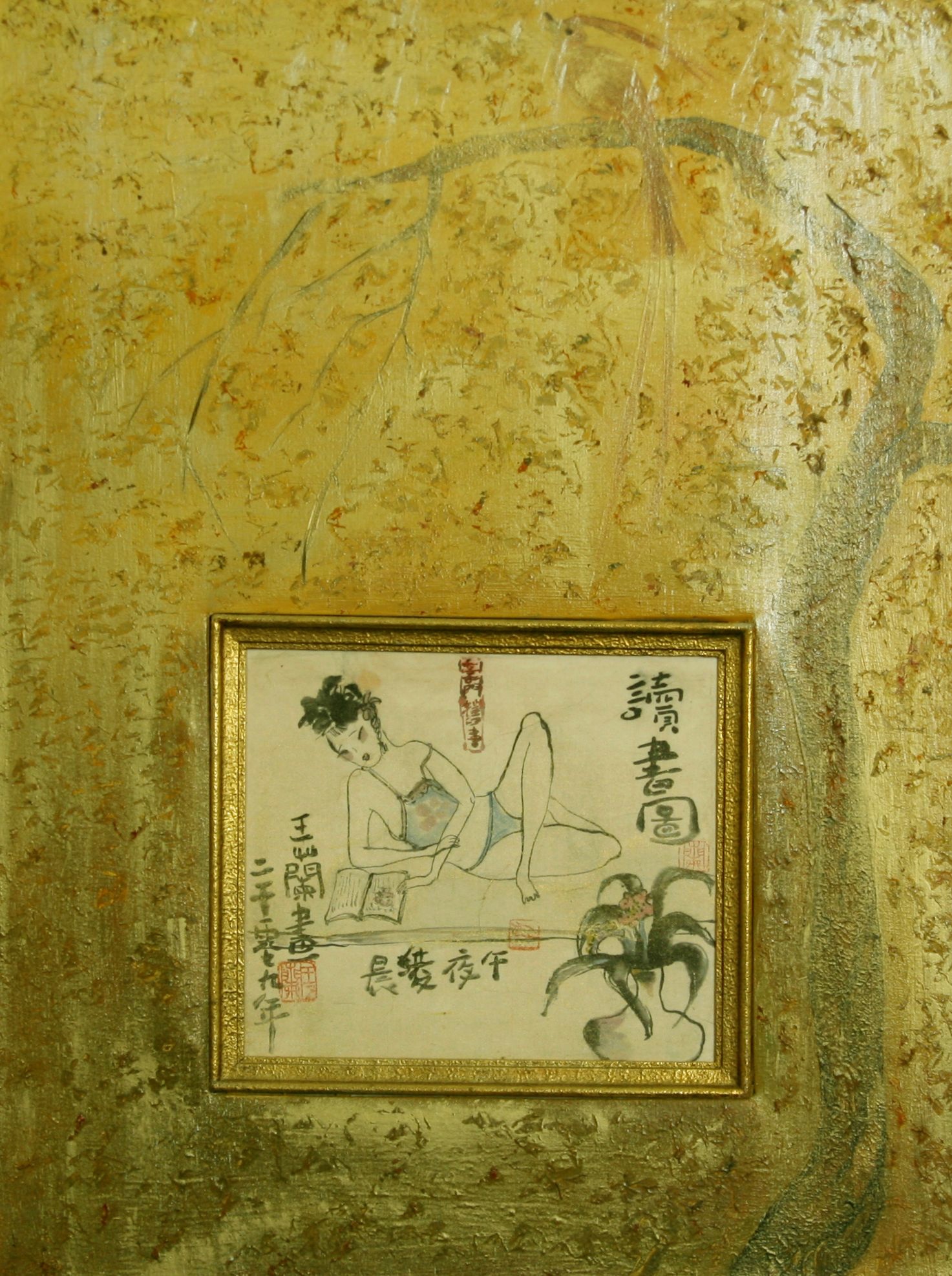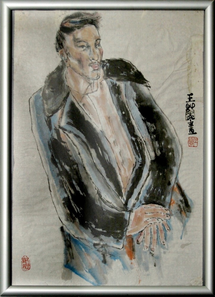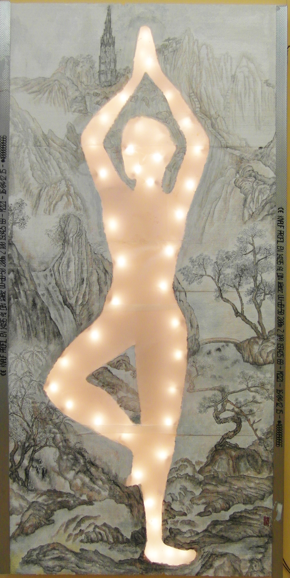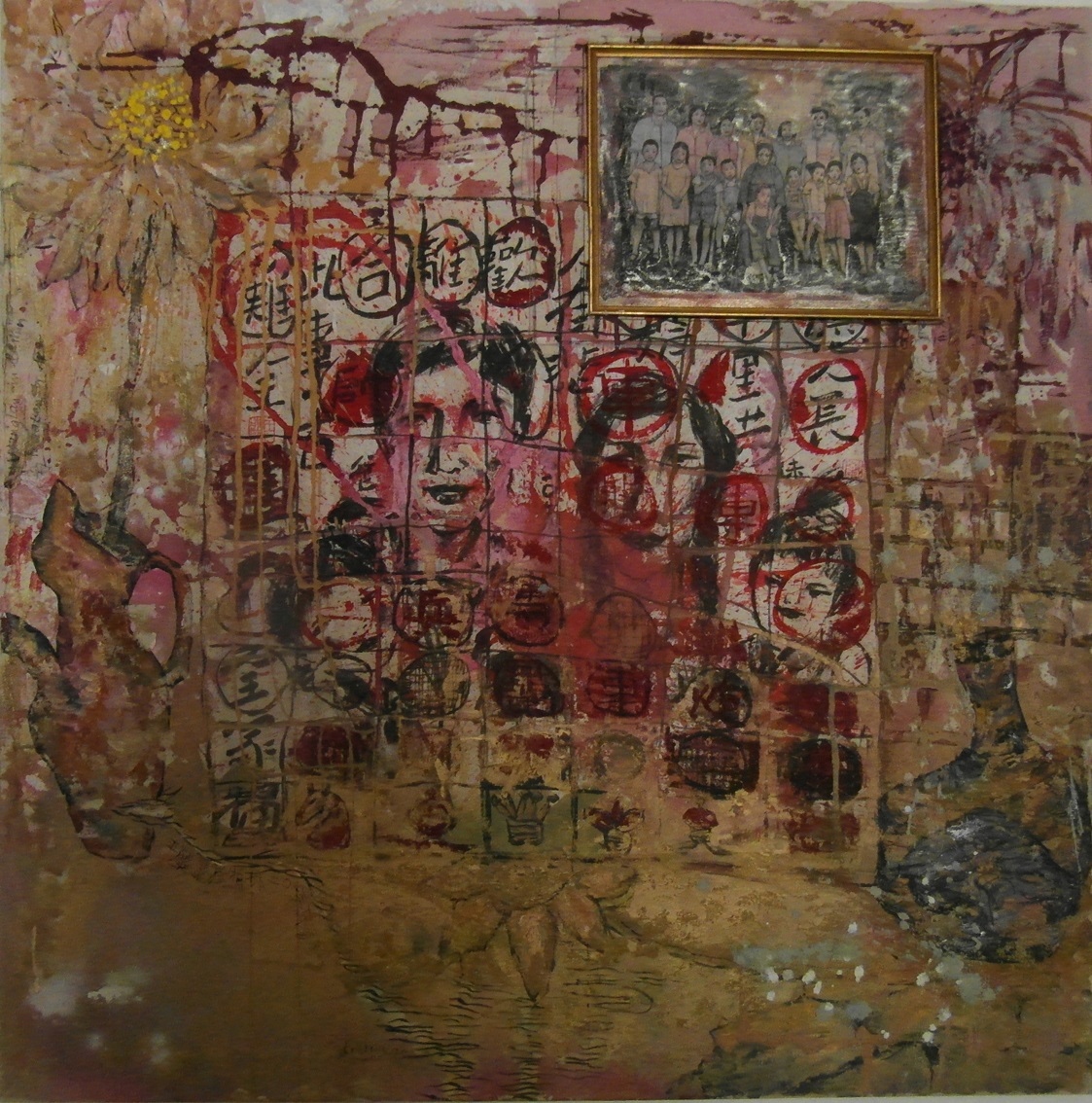 Reispapier über Leinwand, bestickte Seidenjacke + chinesische Wasserfarbe und Tusche.