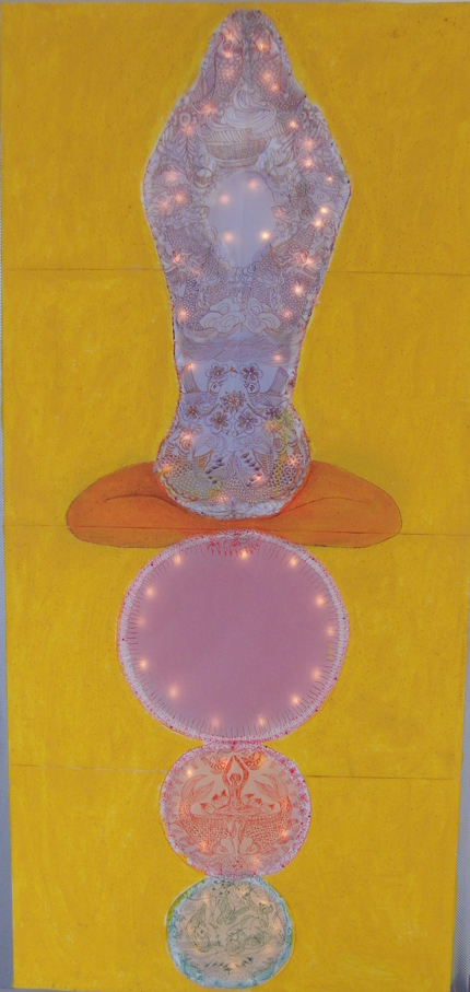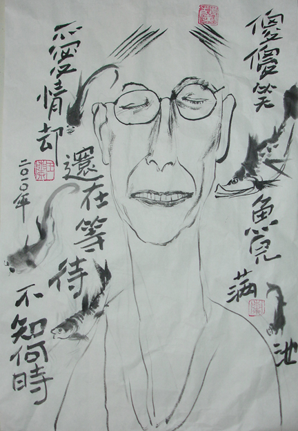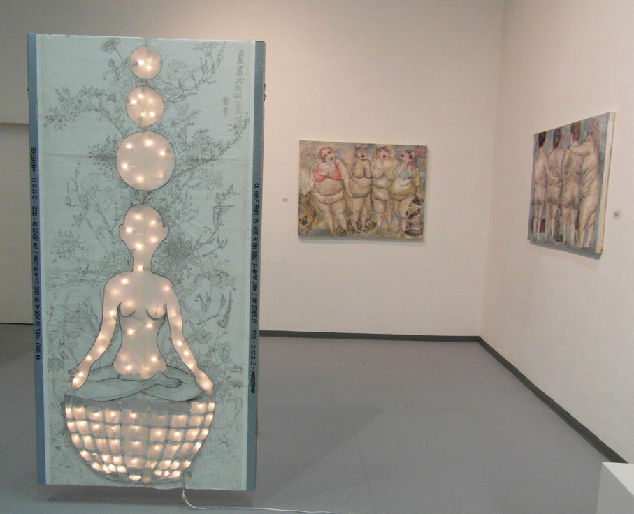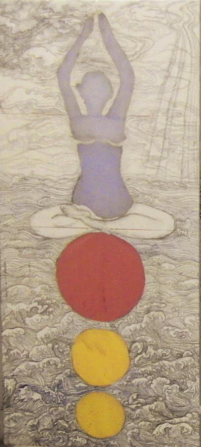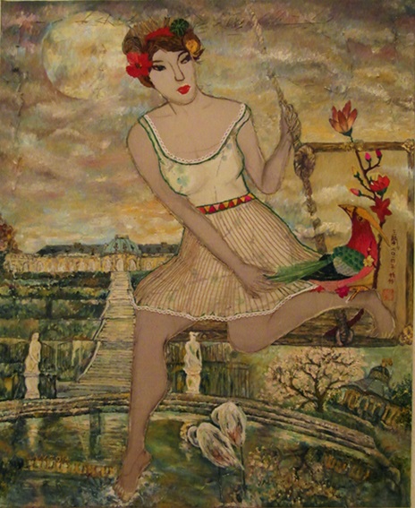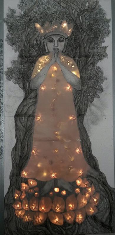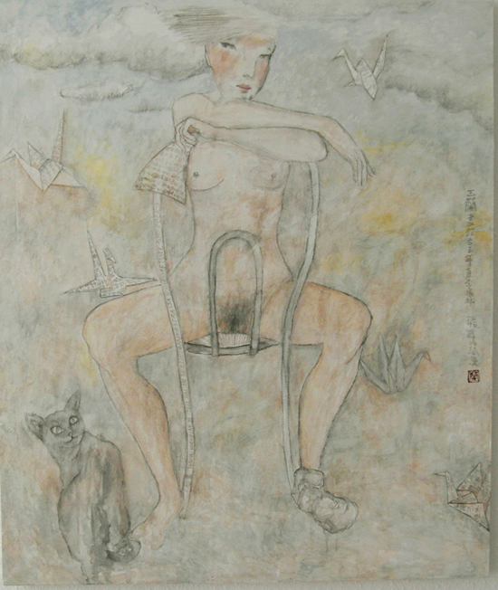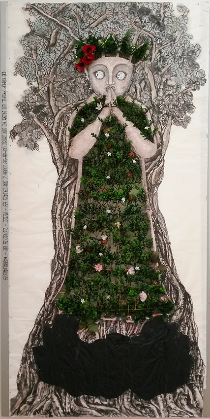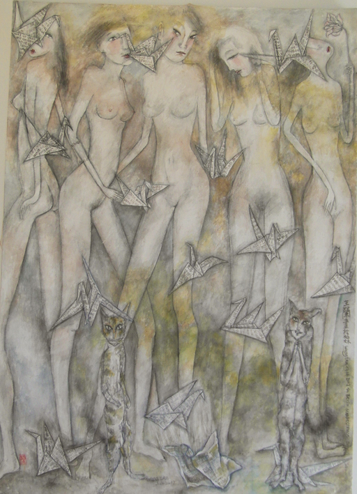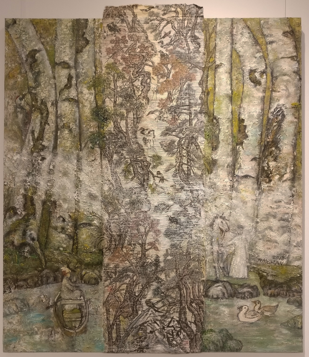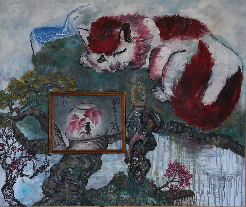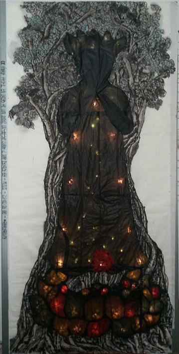 Reispapier über Leinwand, bestickte Seidenjacke + chinesische Wasserfarbe und Tusche.