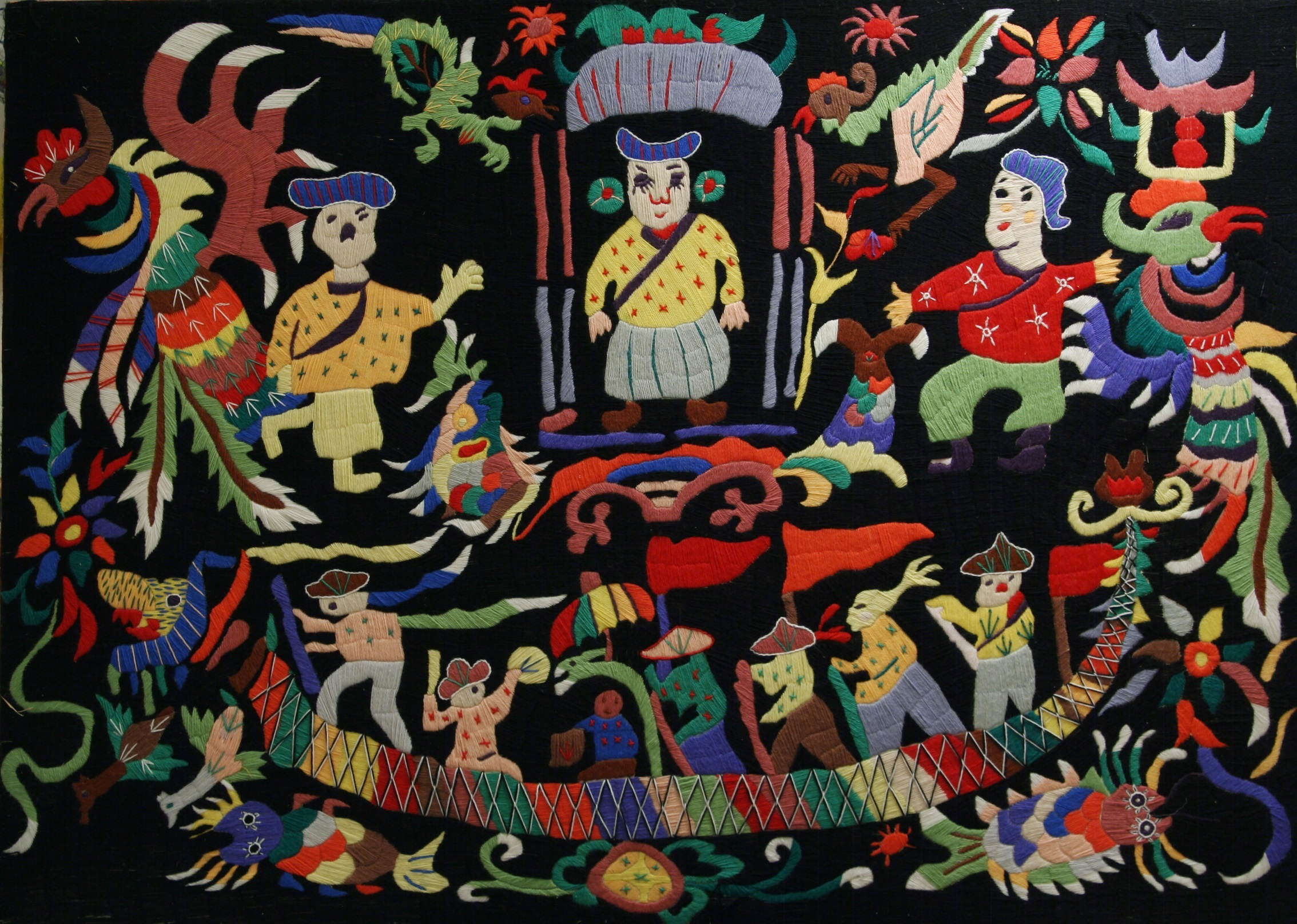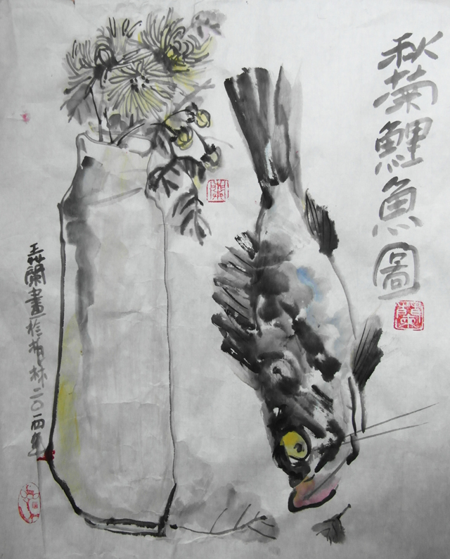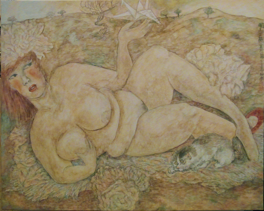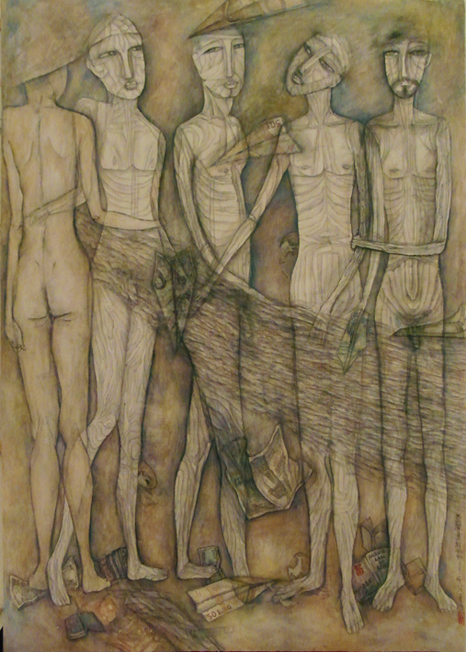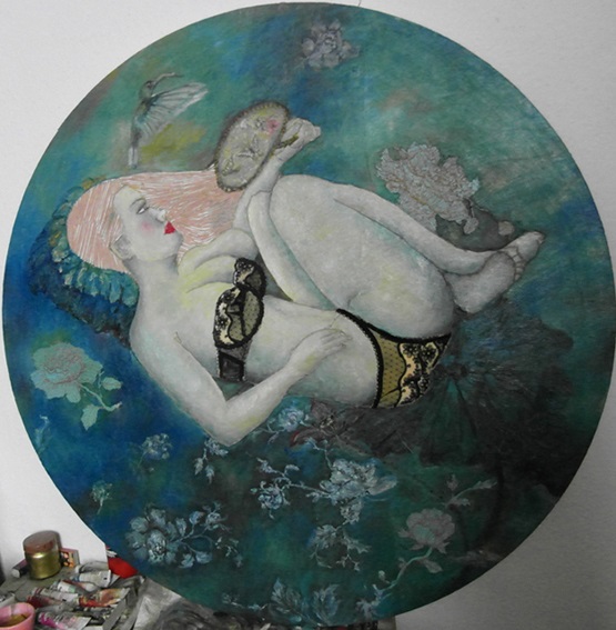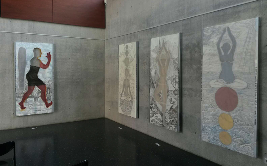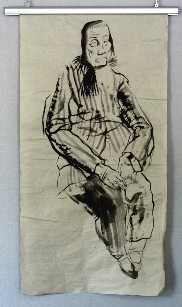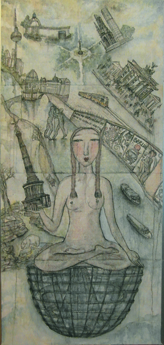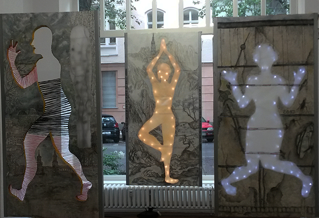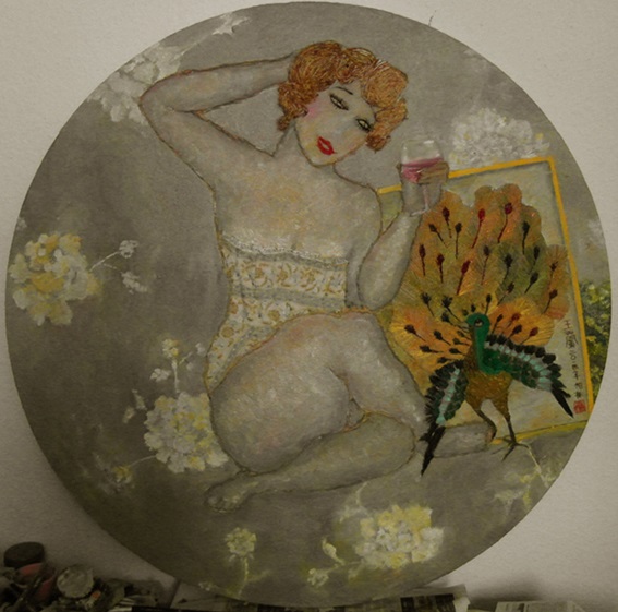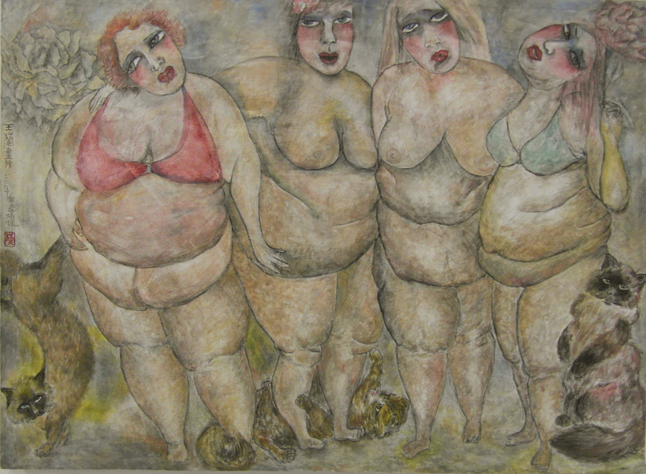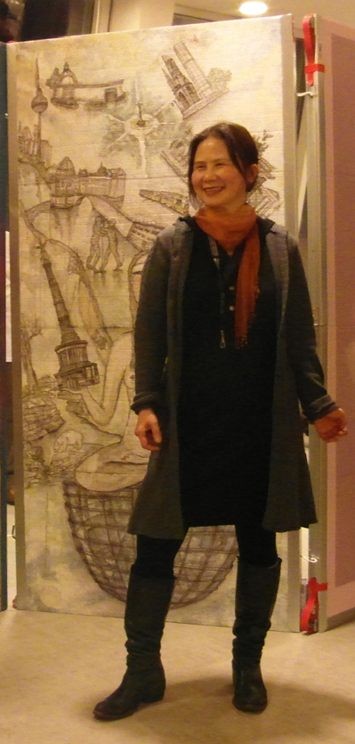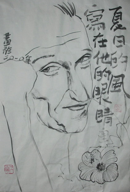 Reispapier über Leinwand, bestickte Seidenjacke + chinesische Wasserfarbe und Tusche.