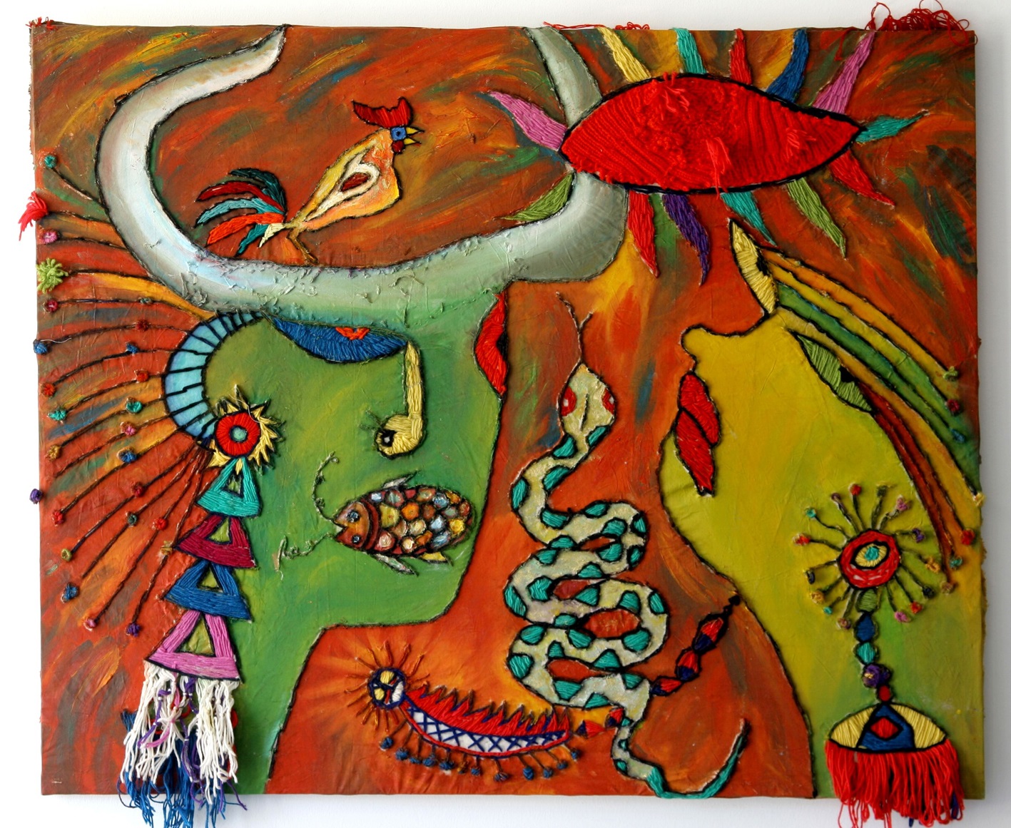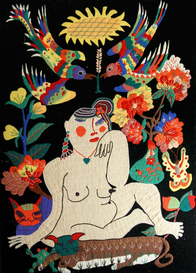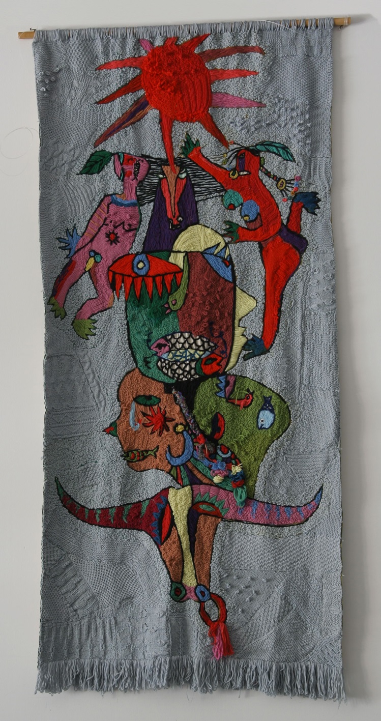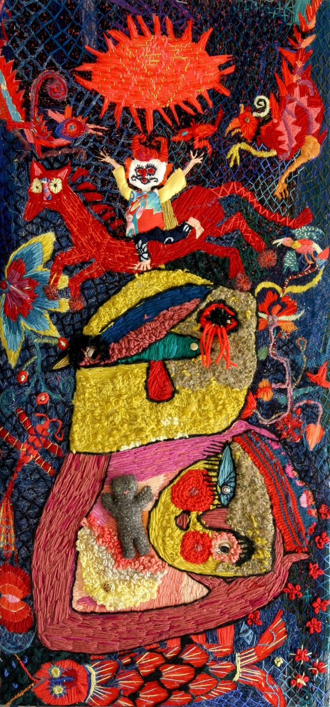 Stickerei und Öl kombiniert in einem Bild.