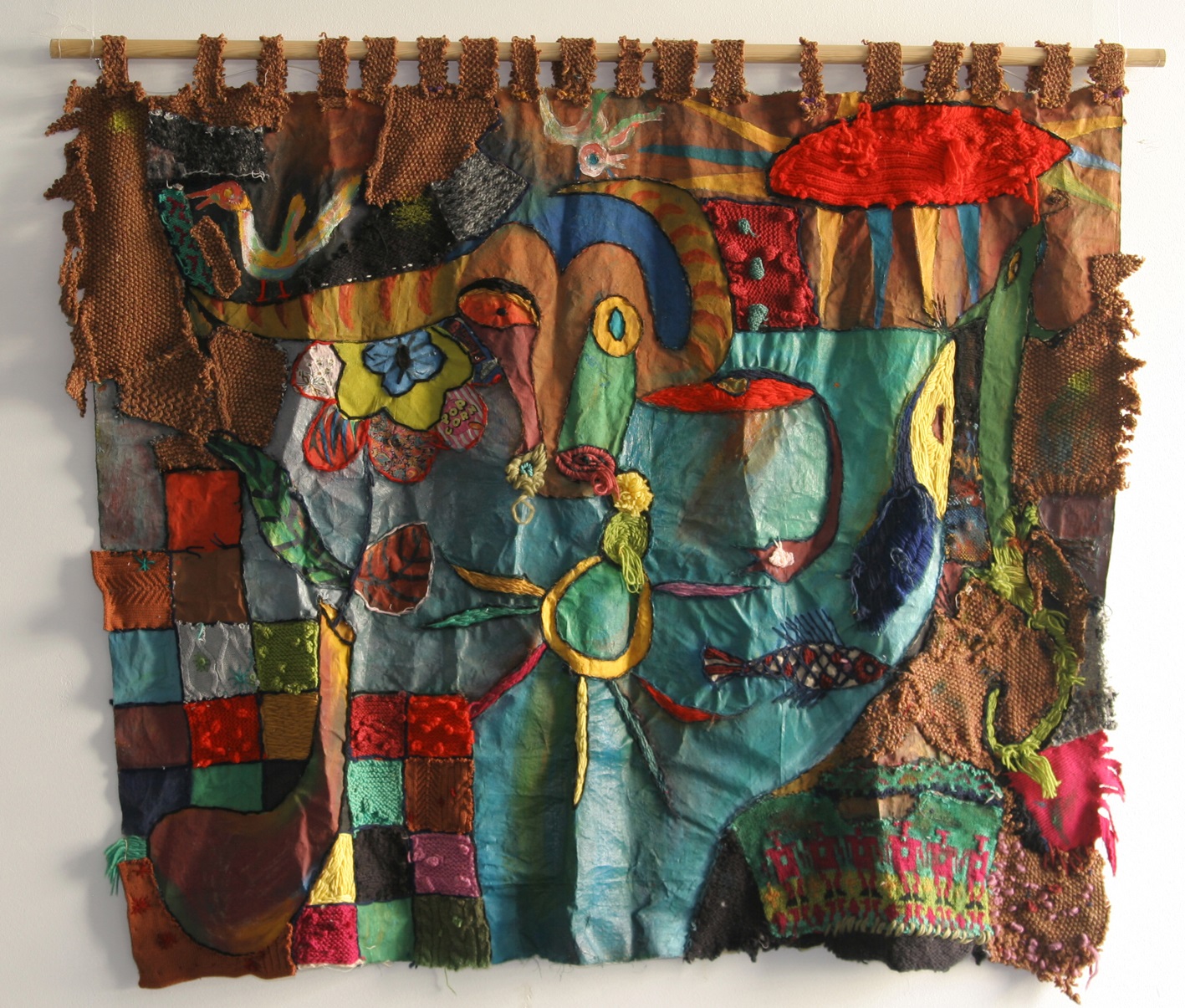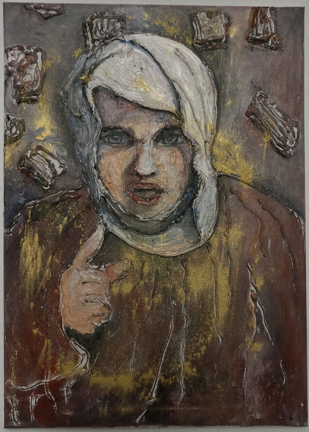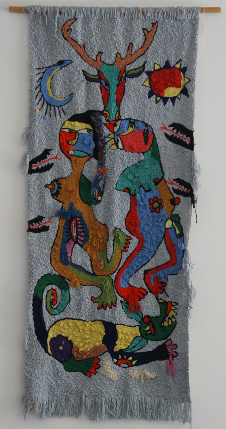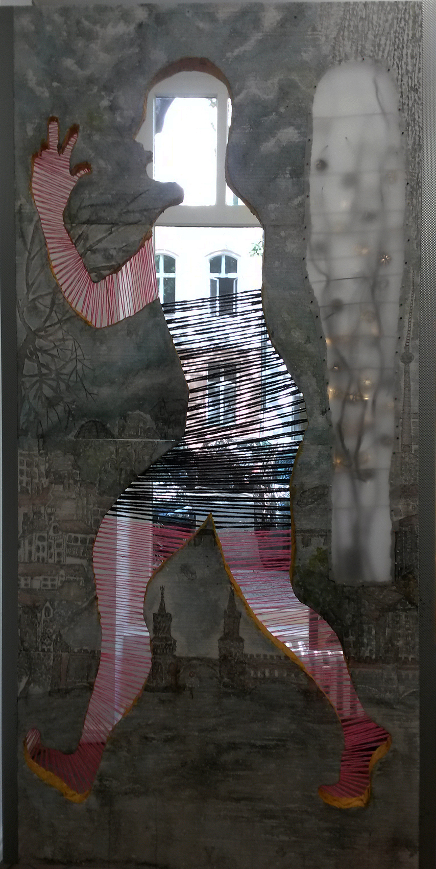 Stickerei und Öl kombiniert in einem Bild.