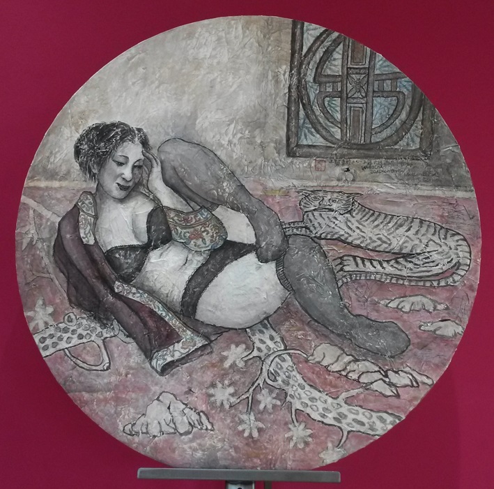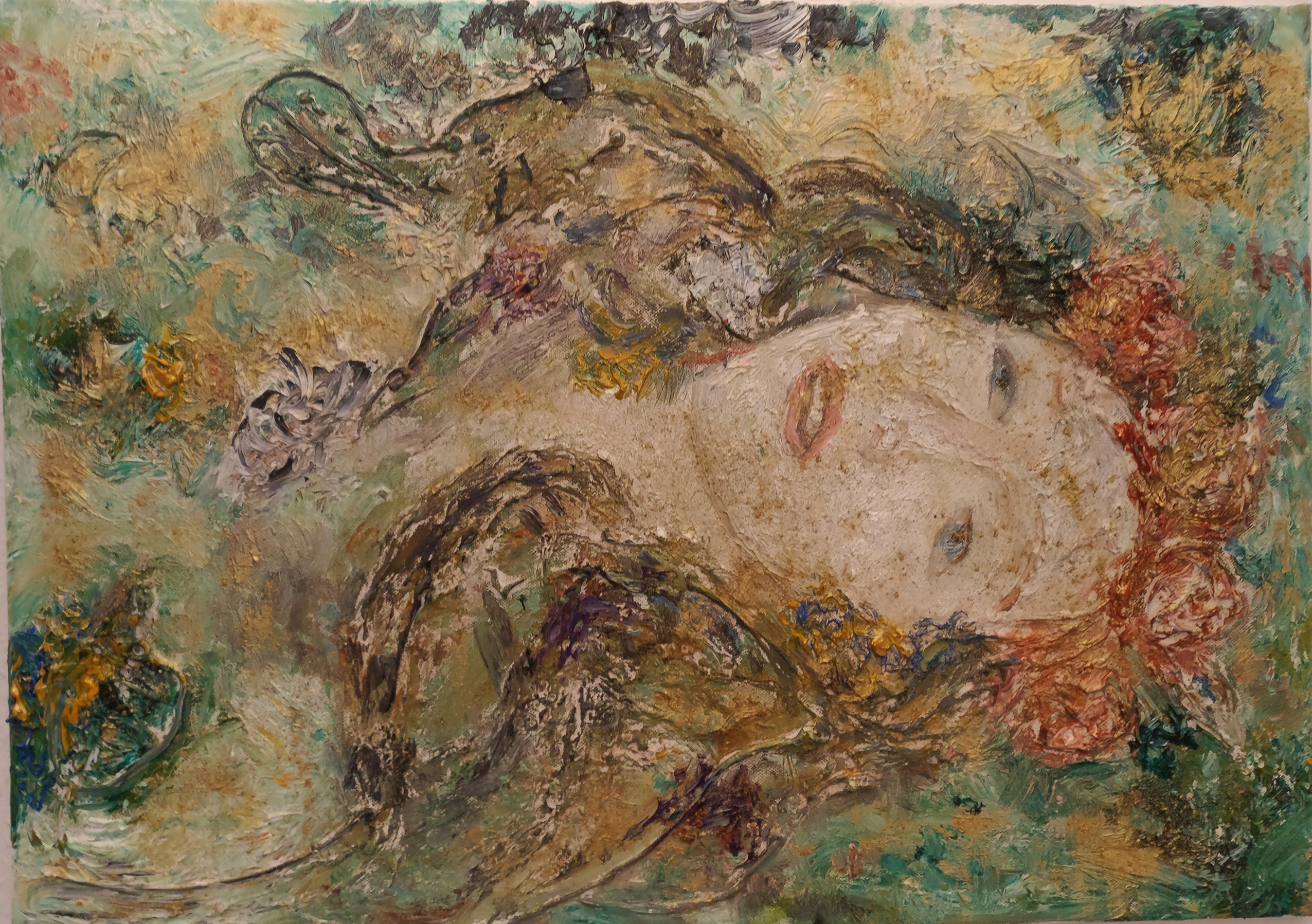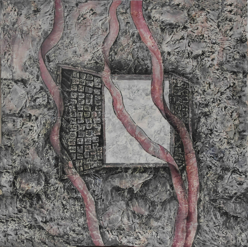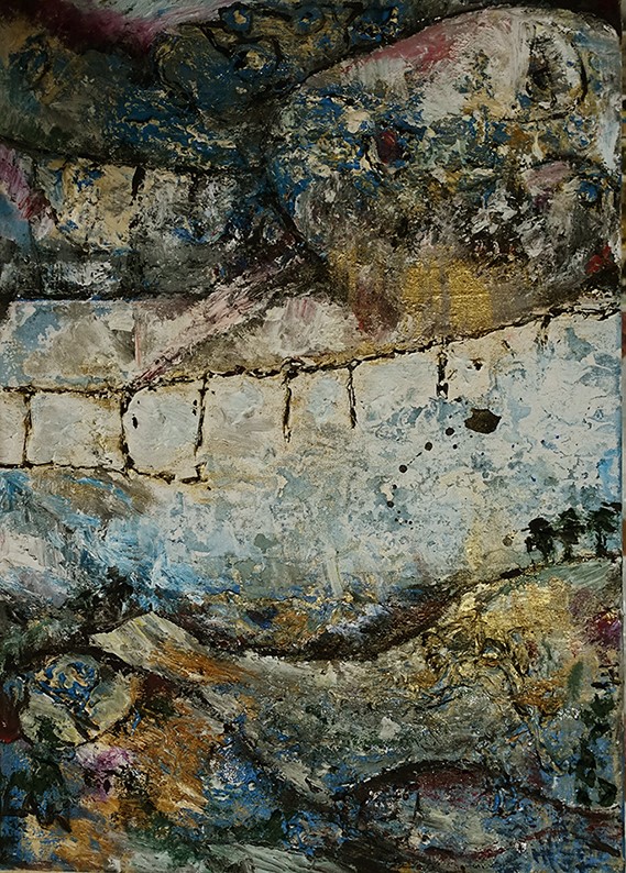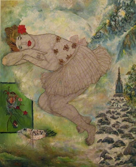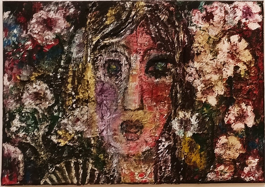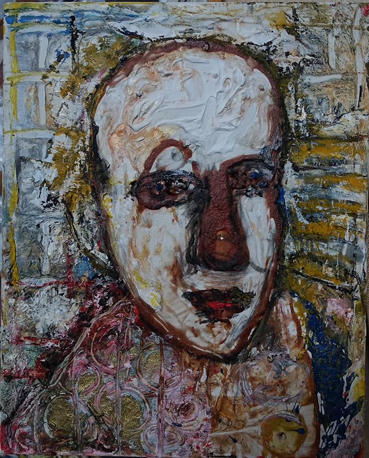 Stickerei und Öl kombiniert in einem Bild.